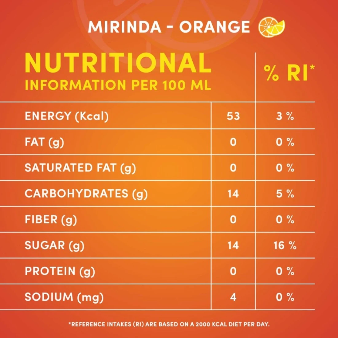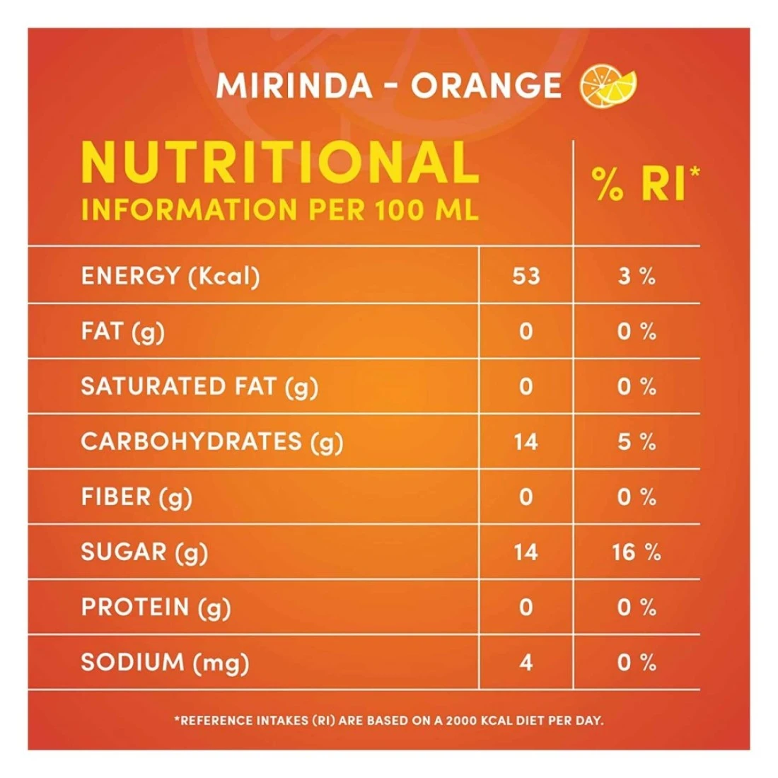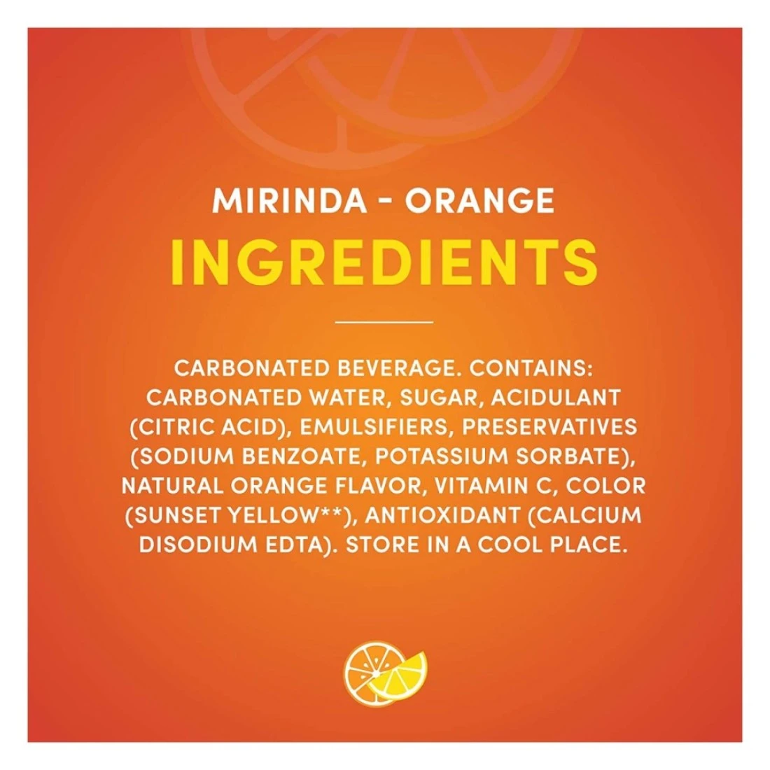 ingredients : مياه معدنية غازية، شراب الذرة ذو الفركتوز العالي، حمض الستريك، نشاء الطعام المعدل، بنزوات البوتاسيوم وسوربات البوتاسيوم (للحفاظ على الطازجية)، صمغ الاستر، نكهات طبيعية، أصفر 6، حمض الأسكوربيك كالسيوم ثنائي الصوديووم إيدتا (لحماية النكهة)، سيترات الصوديوم.
