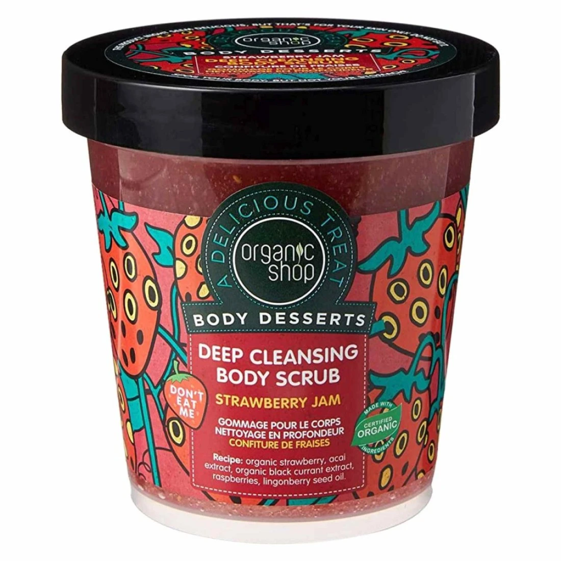 - مقشر الجسم للتنظيف العميق بخلاصة مربى الفراولة ينظف بشرتك ويجددها بلطف ويملأ عقلك بأحلام اليقظة الصيفية