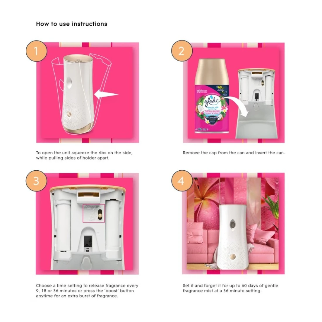 قم بتخصيص تجربة تجديد الهواء في منزلك بإستخدام غلايد بخاخ أوتوماتيكي قابل لإعادة التعبئة برائحة الأزهار الإستوائية الغريبة . إختر إعدادًا على مؤقت الحامل لتوزيع العطر تلقائيًا في الغرفة كل 9 أو 18 أو 36 دقيقة أو إضغط على زر التعزيز للحصول على دفعة فورية في أي وقت تريده. غلايد برائحة الأزهار الإستوائية عبارة عن باقة مريحة من الزيوت العطرية المستمدة من المناطق الإستوائية الفاخرة