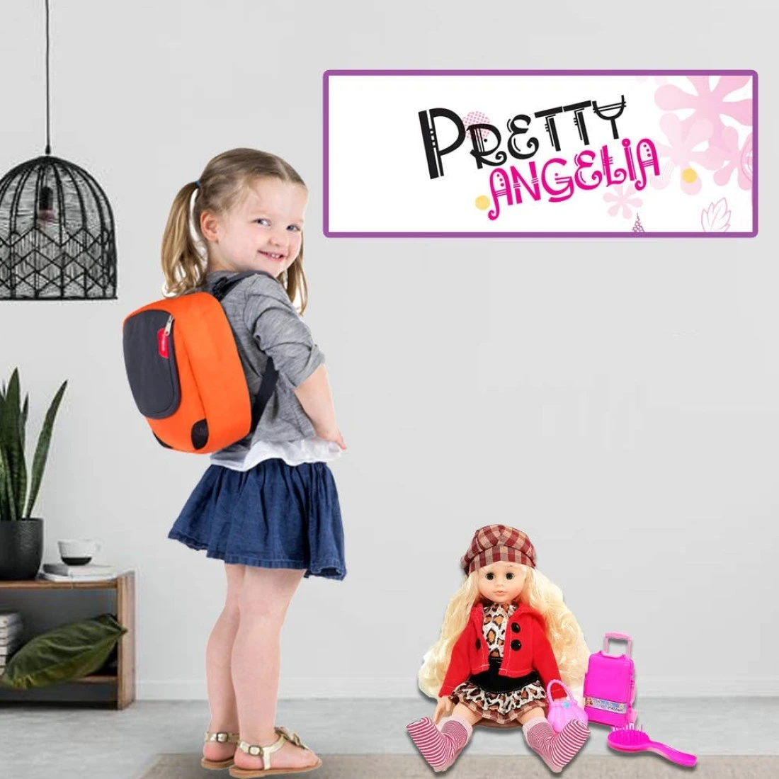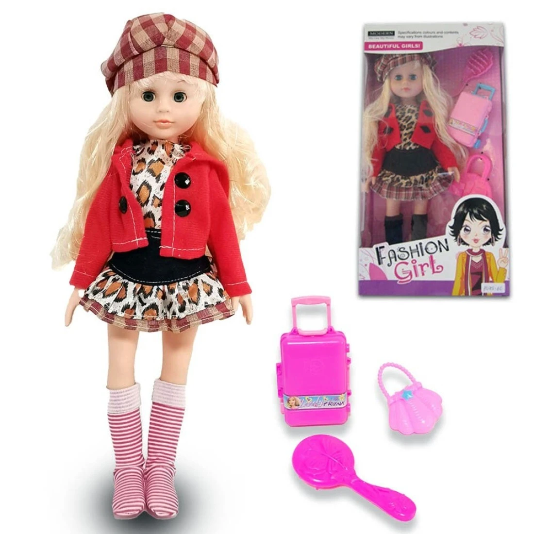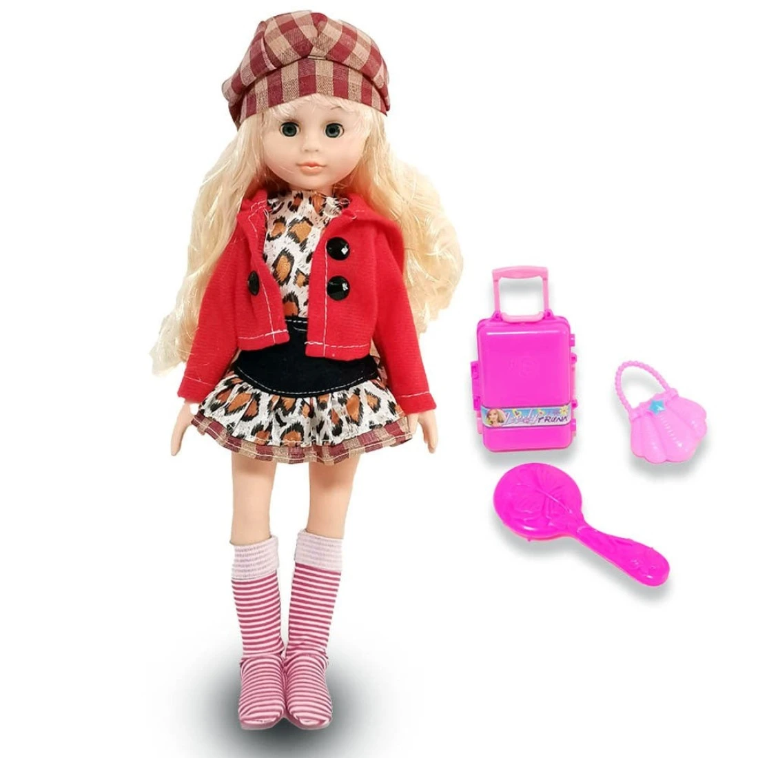 Kidwala blond hair poseable doll with hat, leopard dress & red jacket pretty angelia 14inch size with accessories toys for girls