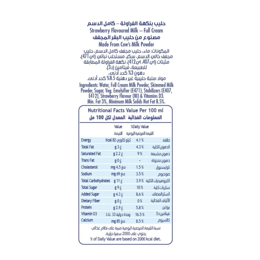 ingredients : ماء ، حليب مجفف كامل الدسم ، سكر ، مثبت معتمد E412 ، E407 ، مستحلب E471 ، نكهة فراولة طبيعية مماثلة للطبيعة ، فيتاميناتD، A ، 8.5٪ مواد صلبة غير دهنية و 1.5٪ دهون حليب
