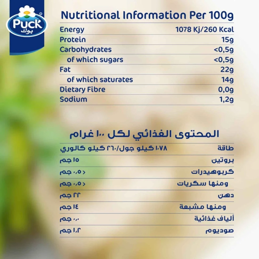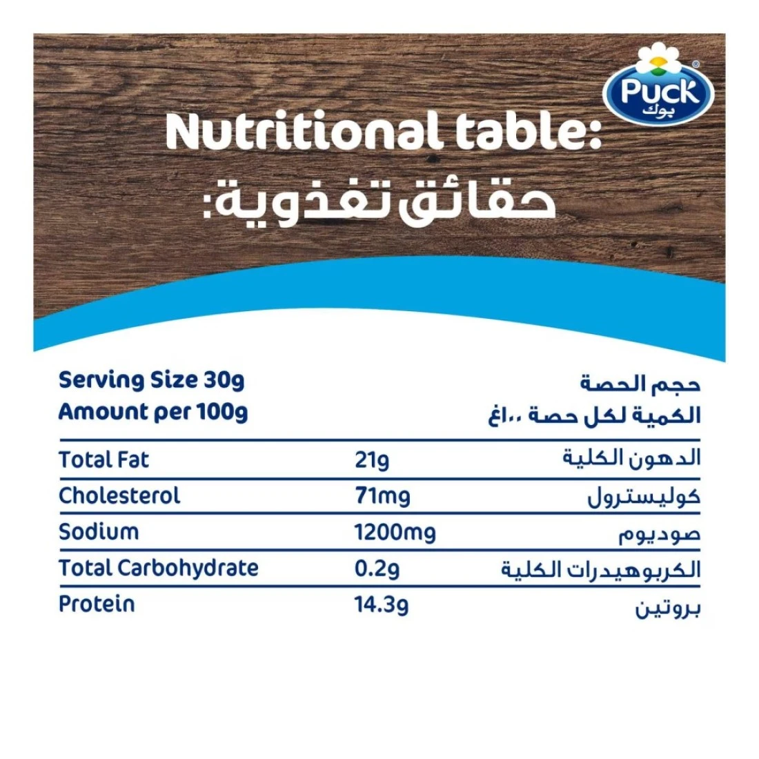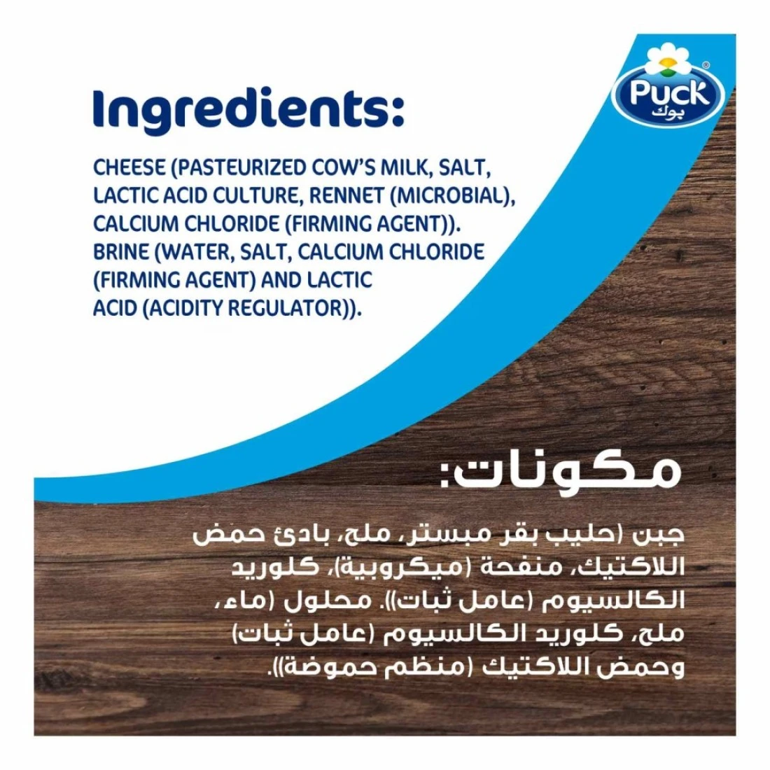 ingredients : الجبن (حليب بقري مبستر، ملح، مستنبت حمض اللاكتيك، منفحة (ميكروبية)، كلوريد الكالسيوم)، محلول ملحي (ماء، ملح، كلوريد الكالسيوم وحمض اللاكتيك)