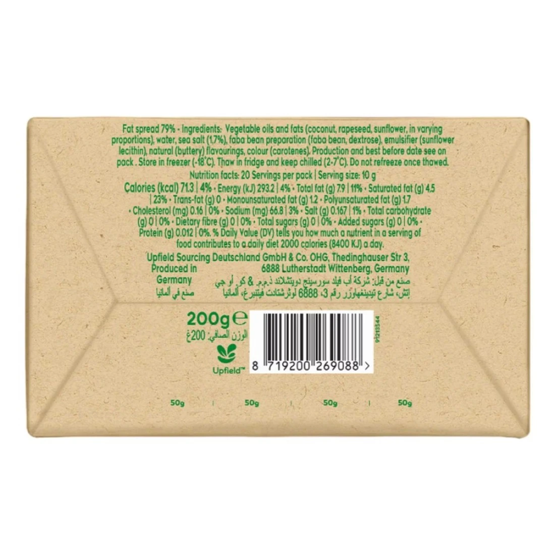 ingredients : الزيوت والدهون النباتية (جوز الهند، بذور اللفت، عباد الشمس، بنسب متفاوتة)، الماء، ملح البحر (1.7٪)، مستحضر الفول (فول الفول، دكستروز)، مستحلب (ليسيثين عباد الشمس)، نكهات طبيعية (زبدية)، لون (كاروتينات)