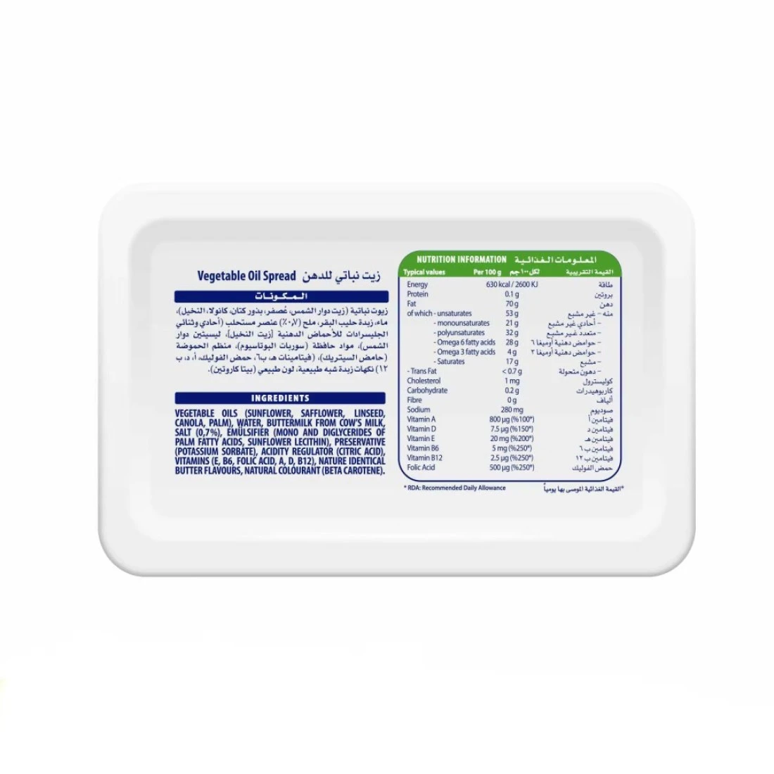 ingredients : زيت نباتي (زيت عباد الشمس، القرطم، بذر الكتان، نخيل الكانولا)، ماء، زبدة حليب من حليب البقر، ملح (0.7%) مستحلب (أحادي ومتعدد الجليسريدات من زيت الأحماض الدهنية، نواة النخيل، ليسيثين عباد الشمس)، مواد حافظة (سوربات البوتاسيوم) (حمضية). ، حمضي، حمضي، حمض الستريك)، (فيتامينات هيبا، حمض الفوليك، أ، د)، نكهات الزبدة الطبيعية