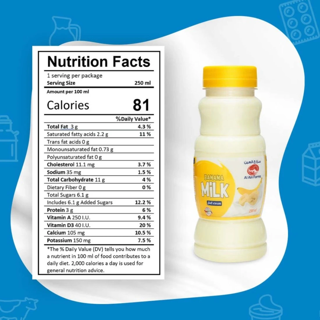 ingredients : حليب بقر طازج كامل الدسم، سكر، نكهة الموز (NI)، ملون طبيعي (كرثاموس)، فيتامين A و D3، الحد الأدنى من الدسم 3٪، الحد الأدنى من جوامد الحليب غير الدسمة 12%