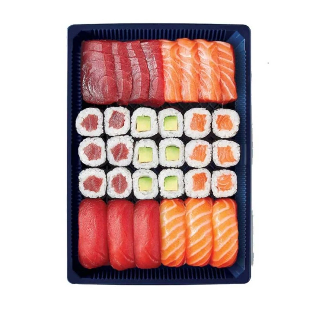 ingredients : شرائح من سمك السلمون الطازج الخام، سمك التونة الخام، أرز السوشي، خل الأرز، الأعشاب البحرية والأفوكادو.