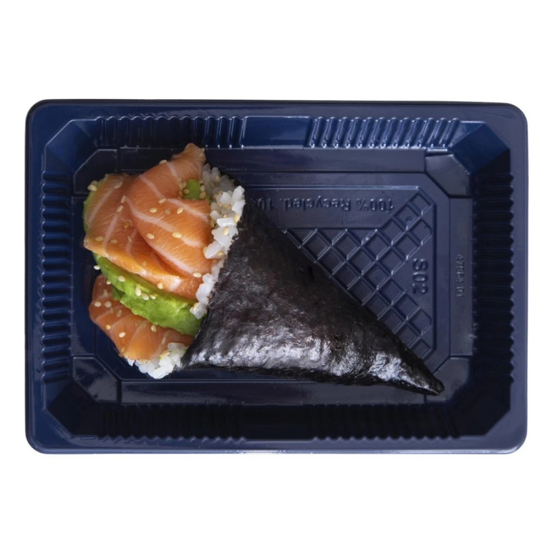 ingredients : أرز السوشي المتبل بالخل، سمك السلمون، أفوكادو، أعشاب البحر نوري وبذور السمسم الأبيض.