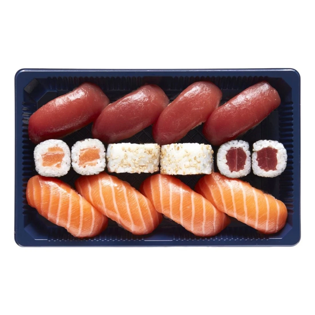 ingredients : أرز سوشي متبل بالخل، تونة، سلمون، سوريمي، أفوكادو، خيار، أعشاب نوري البحرية، وبذور سمسم بيضاء. تتكون وجبة "سوشي ديلي منيو 3" من 4 سلمون نيجيري، 4 تونة نيجيري، 2 سلمون ماكي، 2 تونة ماكي، و2 كاليفورنيا رول.