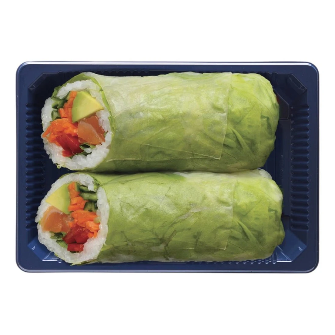 ingredients : أرز السوشي المتبل بالخل، سلمون، أفوكادو، خيار، جزر مخلل، ورقة أرز، فليفلة حمراء، خس، كزبرة ونعناع.