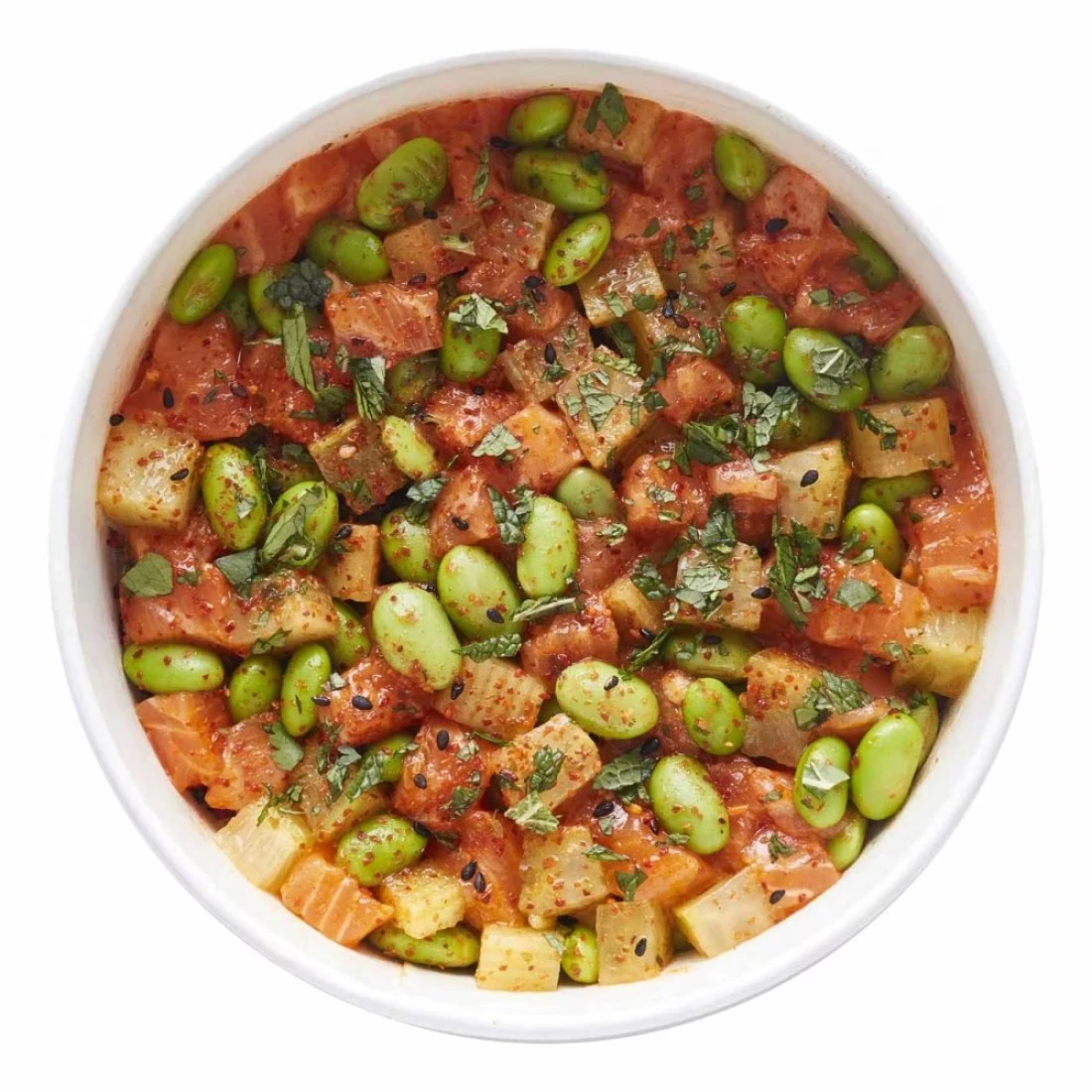 ingredients : أرز سوشي متبل بالخل، سلمون، خيار، إدامامي، سريراتشا، شيشيمي، كزبرة، نعناع، وملح.