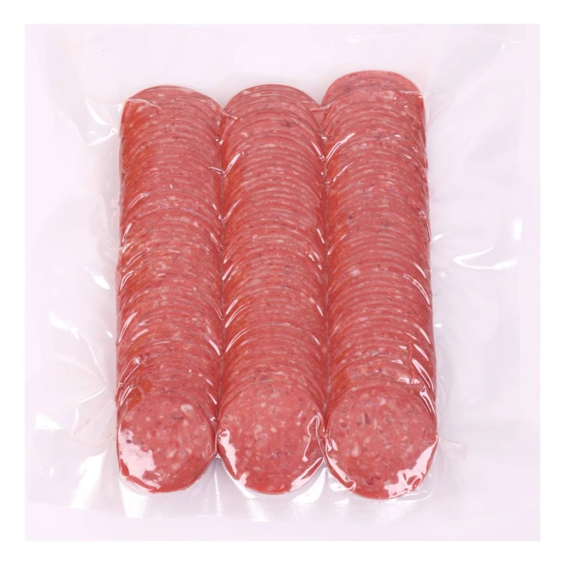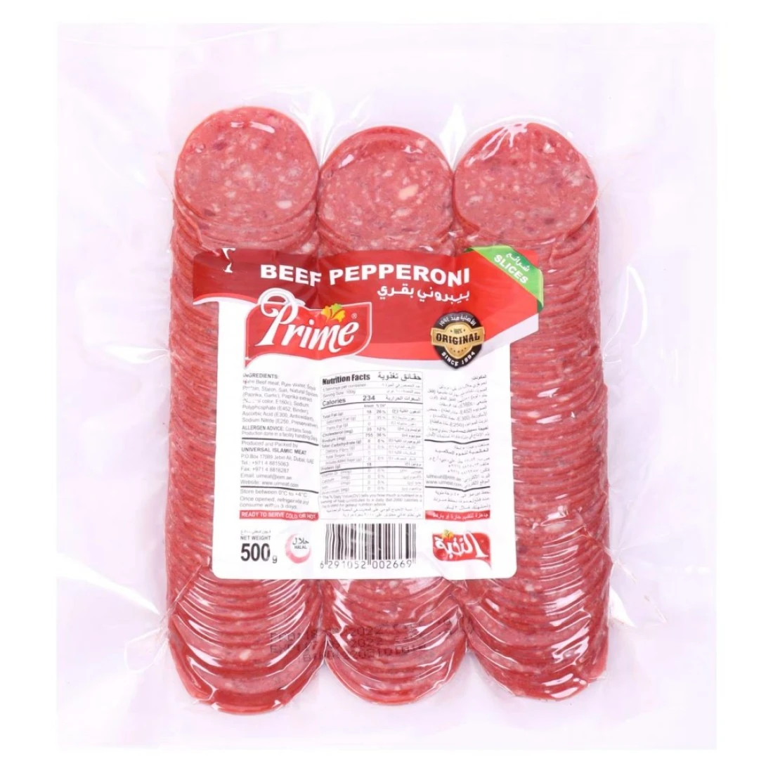 ingredients : لحم بقري حلال ، ماء نقي ، بروتين صوفا ، نشا ، ملح ، بهارات طبيعية (بابريكا ، ثوم) ، مستخلص البابريكا ( N I Color ، E160c) ، بولي فوسفات الصوديوم (E452 ، بيندر). حمض الأسكوربيك (E300 ، نتريت الصوديوم المضاد للأكسدة (E250 ، مادة حافظة)