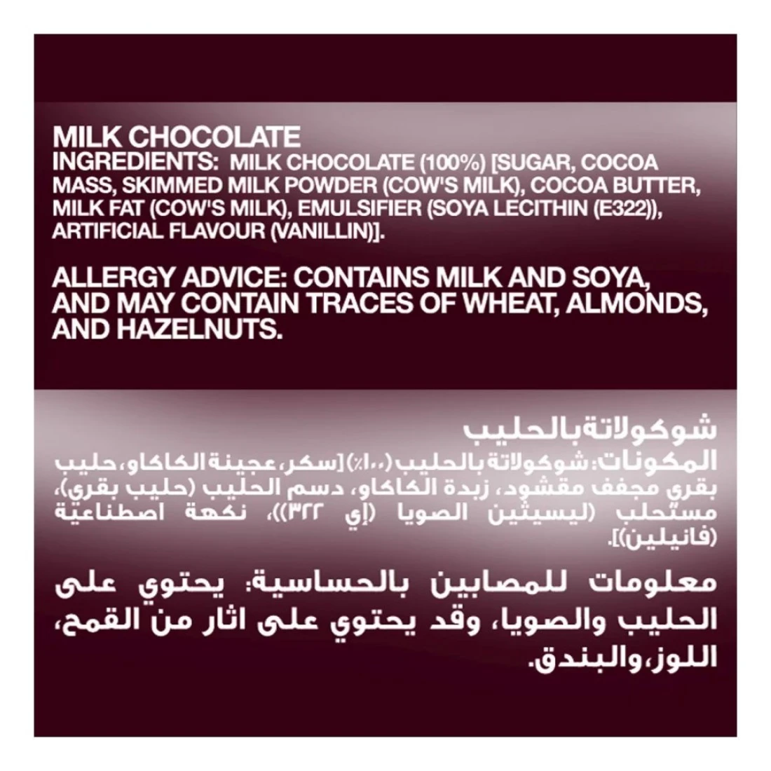 ingredients : شوكولاته الحليب (100%) [سكر، كتلة الكاكاو، مسحوق الحليب منزوع الدسم (حليب البقر)، زبدة الكاكاو، دهن الحليب (حليب البقر)، مستحلب (ليسيثين الصويا (E322))، نكهة اصطناعية (فانيلين)]