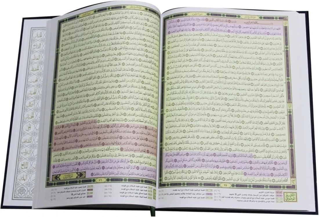 We linked with it the objective division of the verses of the Holy Qur’an by giving each topic a color that suits it on the Qur’anic sheet with an explanation for it. At the bottom of the newspaper