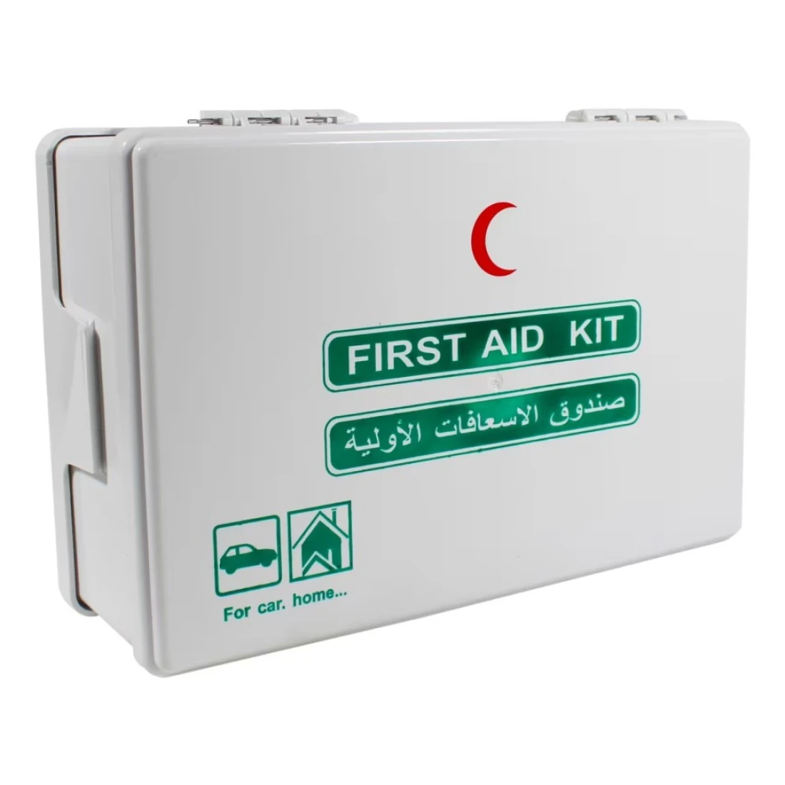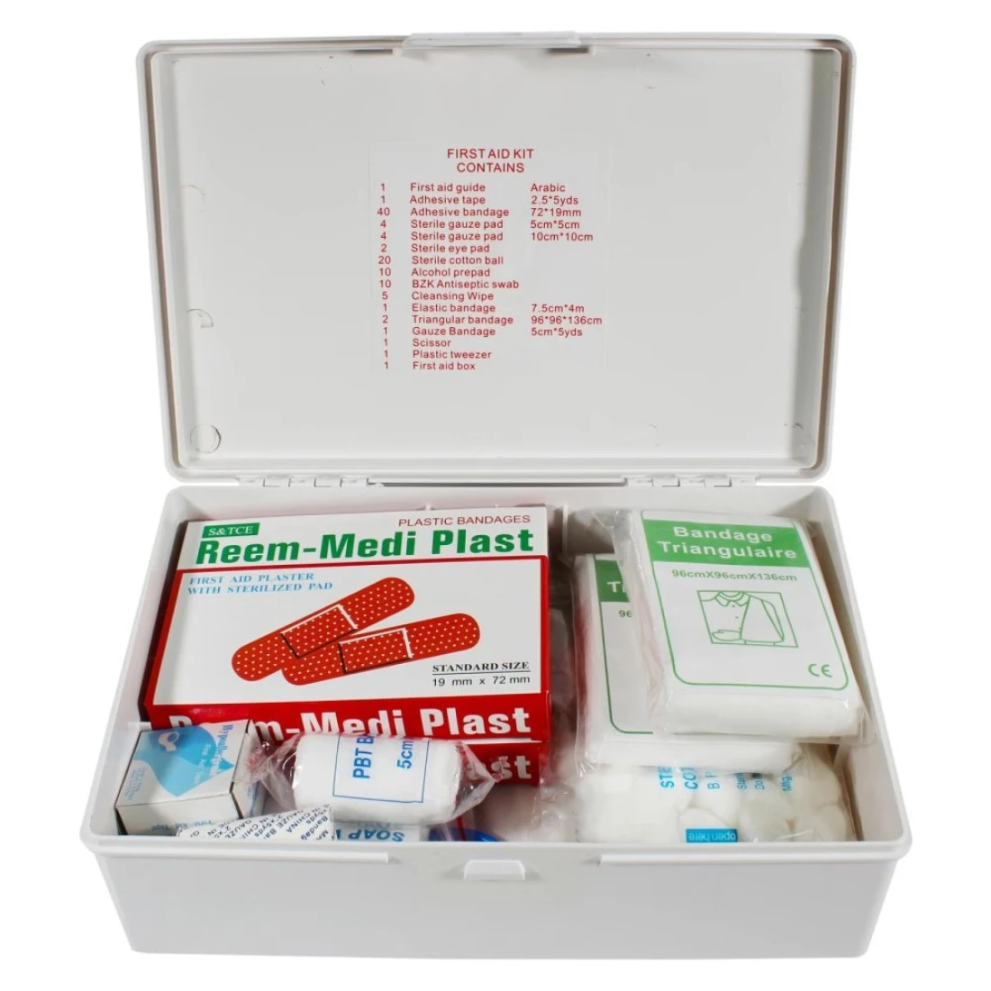 - تتضمن المجموعة - شريط لاصق 1x (2.5x5ياردات)، 40x ضمادة لاصقة (72x19 ملم) 4x وسادة شاش معقمة (5 سم × 5 سم)، 4x وسادة شاش معقمة (10 سم × 10 سم)، 2x وسادة عين معقمة، 20x كرة قطنية معقمة، 10x وسادة كحول مسبقة، 10x مسحة مطهرة من بي زي كا، 5x منديل تنظيف، 1x ضمادة مرنة (7.5 سم × 4 م)، 2x ضمادة مثلثة (96 × 96 × 136 سم)، 1 × ضمادة شاش (5 سم × 5 ياردة)، 1 × مقص، 1 × ملقط بلاستيكي، 1 × صندوق إسعافات أولية، 1 × دليل إسعافات أولية (عربي)
