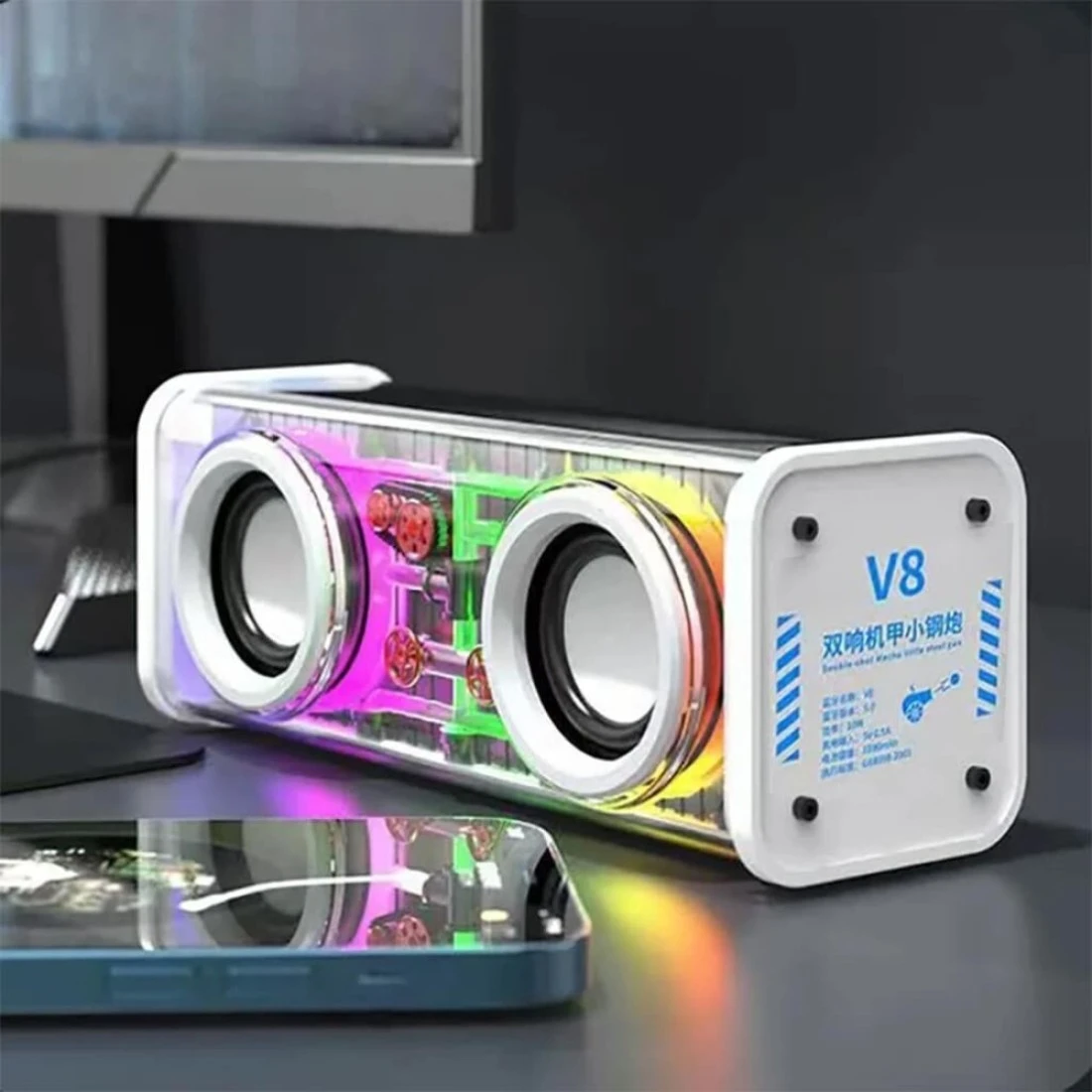 V8 Bluetooth Speaker, Dual Speakers, High Power Subwoofer, White