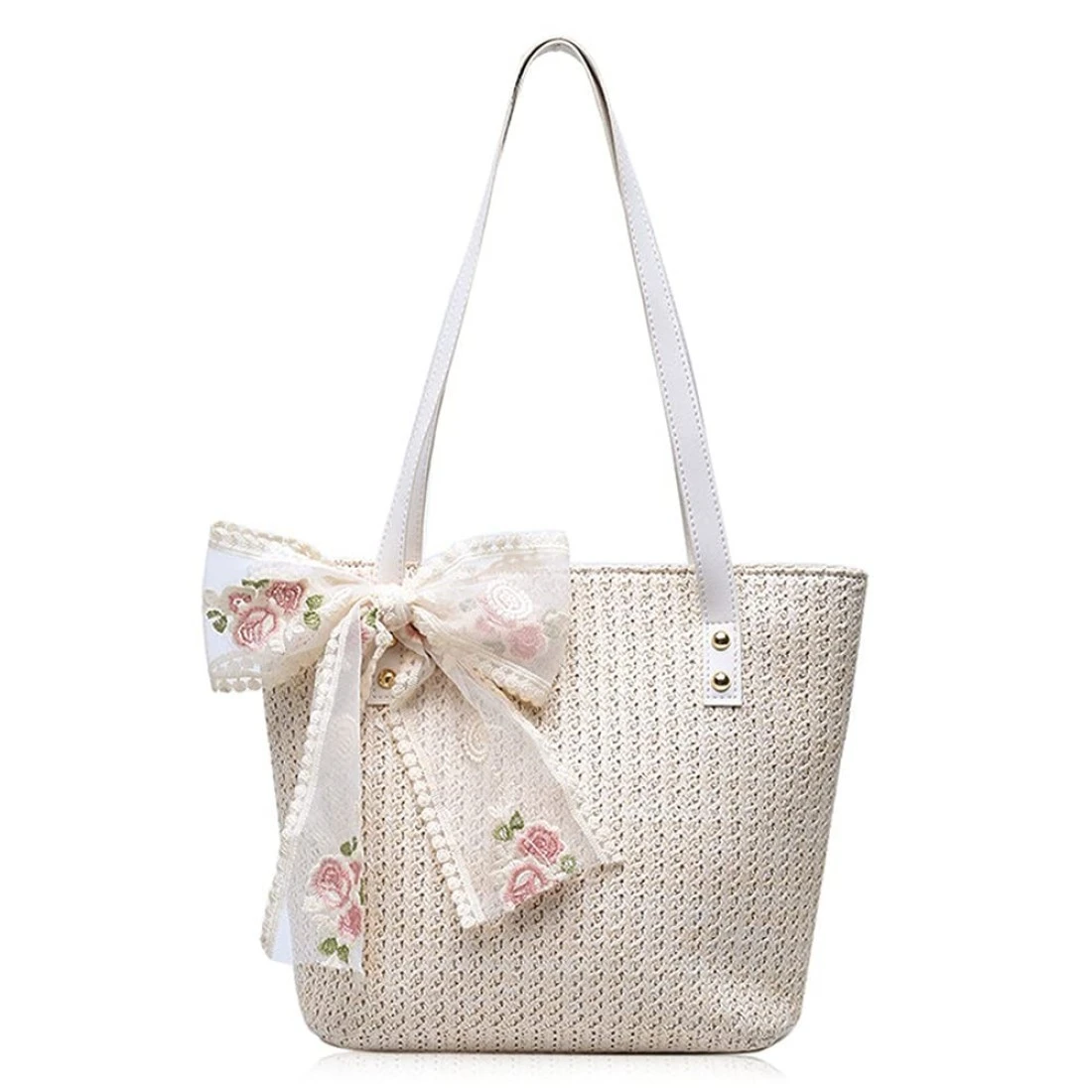 QTKJ Women Large Straw Beach Tote Bag Summer Hand-woven Bags Shoulder Bag Leather Handle Beach Handbags with Cute Lace Bow Small (White)