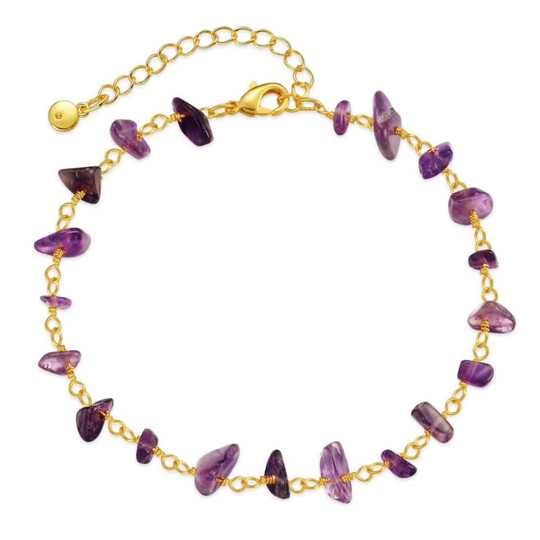 Ladywowu Natural Gemstone Ankle Bracelet for Friends, Gold Tone Adjustable Large Ankle Bracelets for Women, Amethyst Beaded Chain Anklets for Foot Jewelry