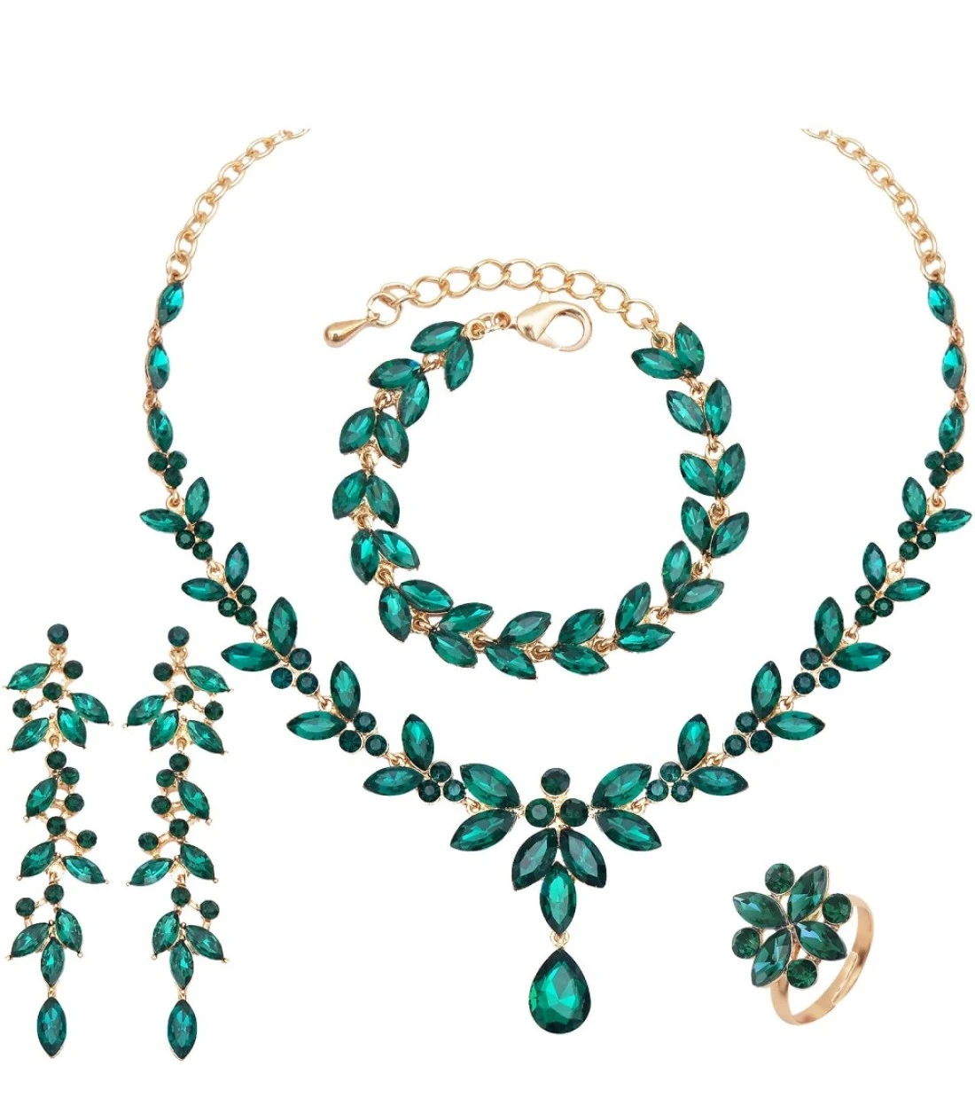 CSY 4 Pcs Elegant Bridal Jewelry Sets Austrian Marquise Crystal Wedding Necklace Dangle Earrings Tennis Bracelet Ring Set for Bride Women Costume Accessories (green crystal-gold tone)