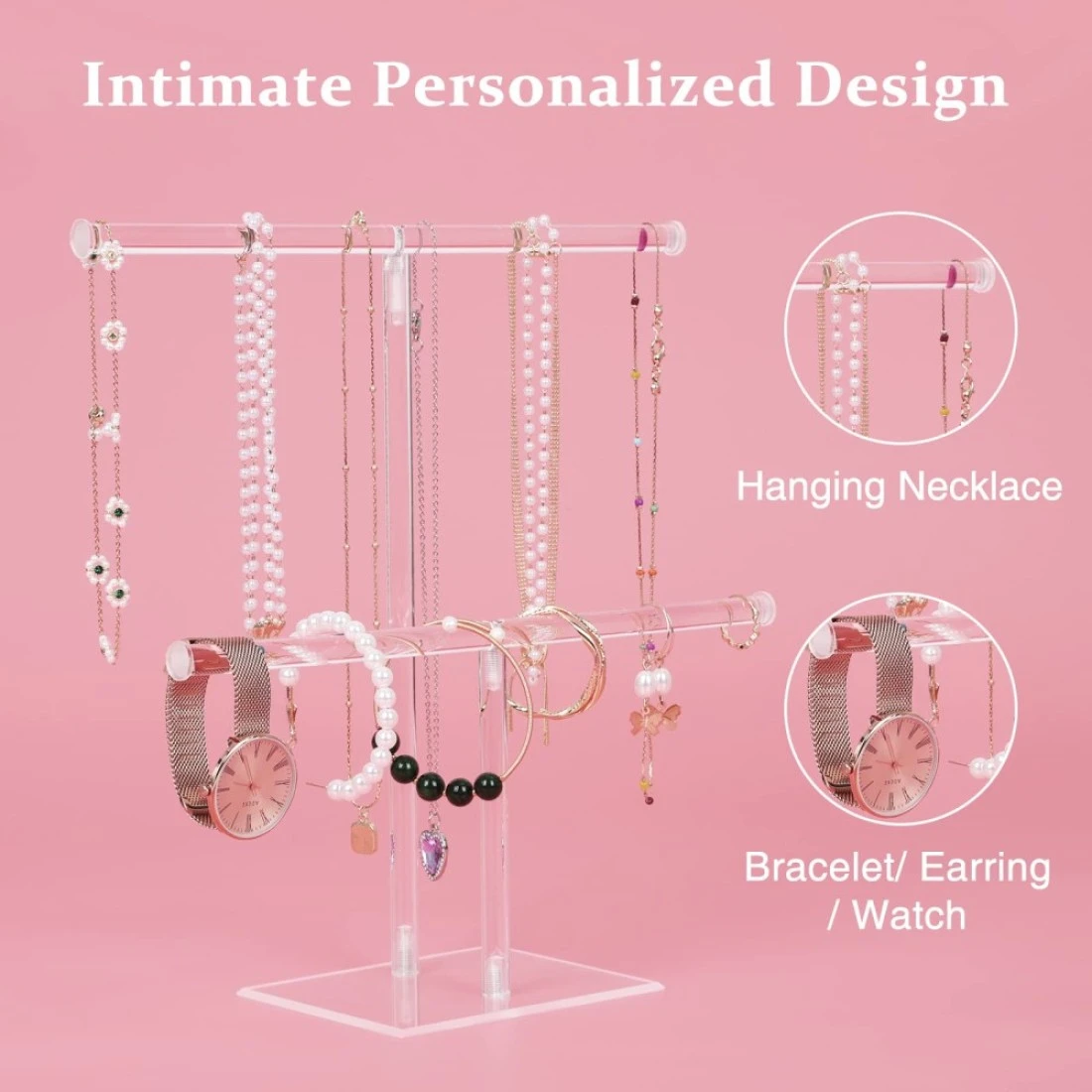 Jewelry Stand Necklace Holder Acrylic Jewelry Display Holder Necklace and Bracelet Hanging Organizer Clear 2Tier Tower Stand for Bangles Necklaces Bracelets Rings Earrings and Watch