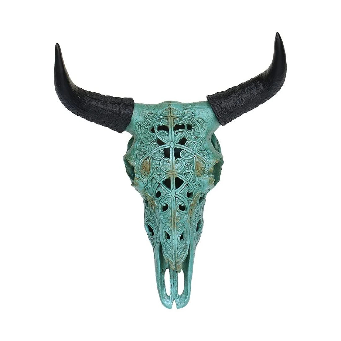 OTARTU Turquoise Tribal Design Carved Steer Skull Wall Hanging Sculpture, Cow Skull 19 Inch Steer Head Bull Skull Wall Décor (Turquoise)