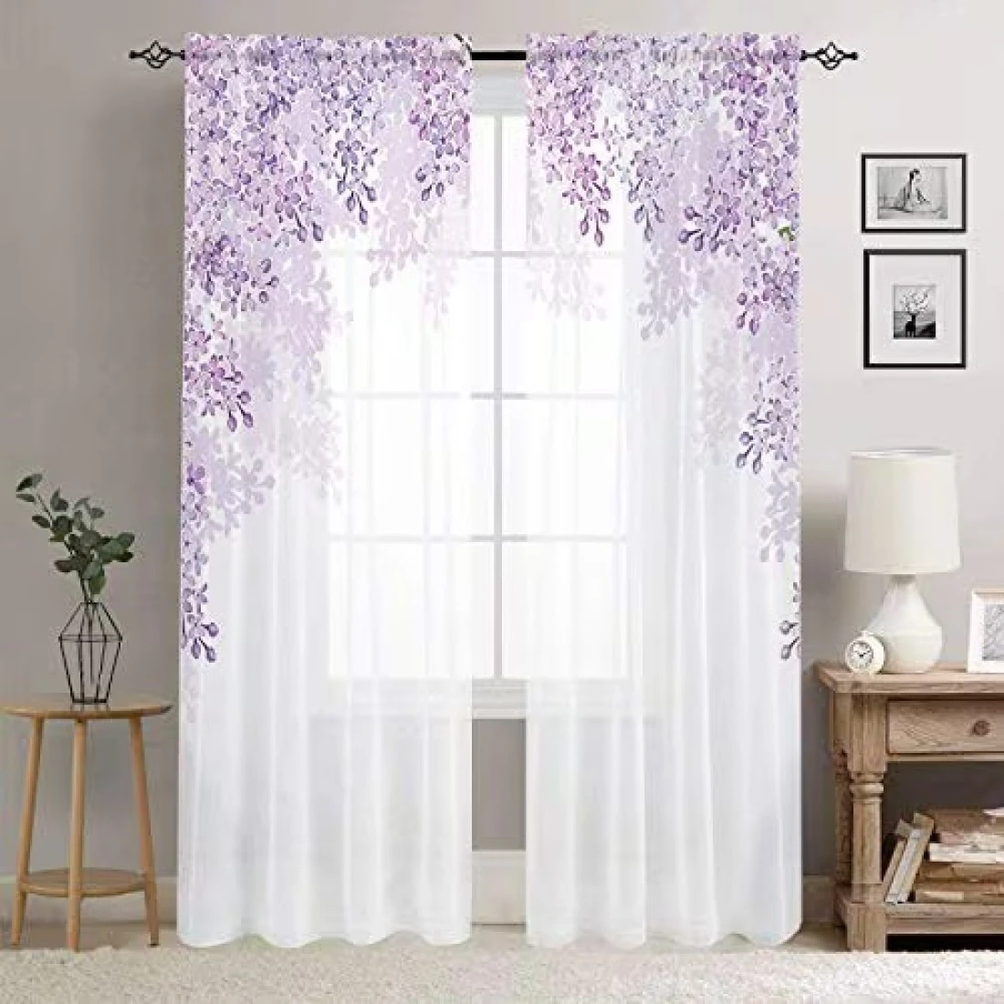 Manerly Violet Lilac Flowers Sheer Curtains for Living Room Bedroom Kitchen Window Voile Curtain Drapes 54W x 63L Inches (Set of 2 Panels)