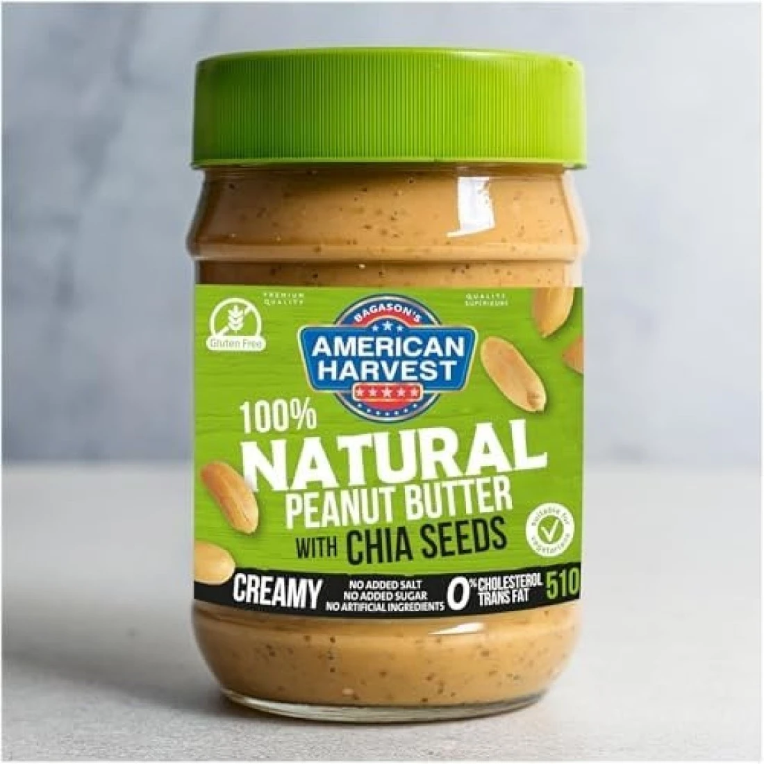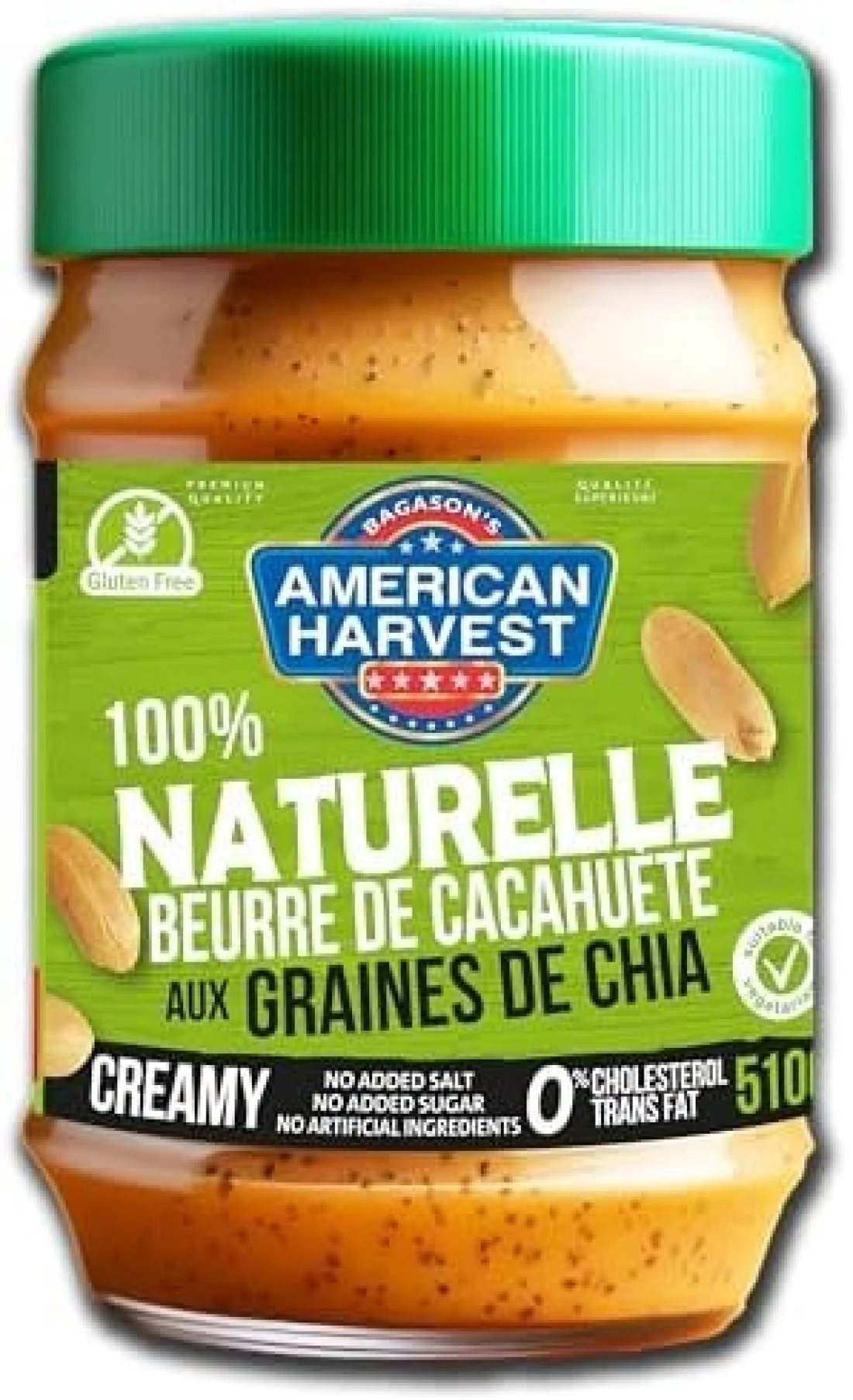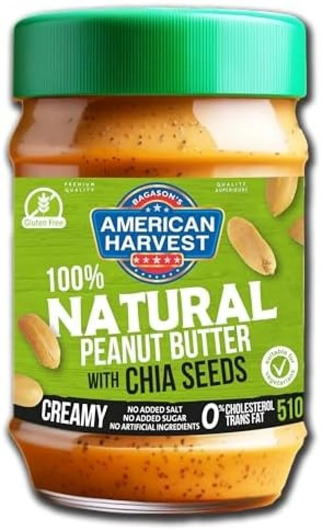 امريكان هارفست زبدة الفول السوداني الطبيعية 100% مع بذور الشيا بدون سكر مضاف / ملح محلي، 510 جرام