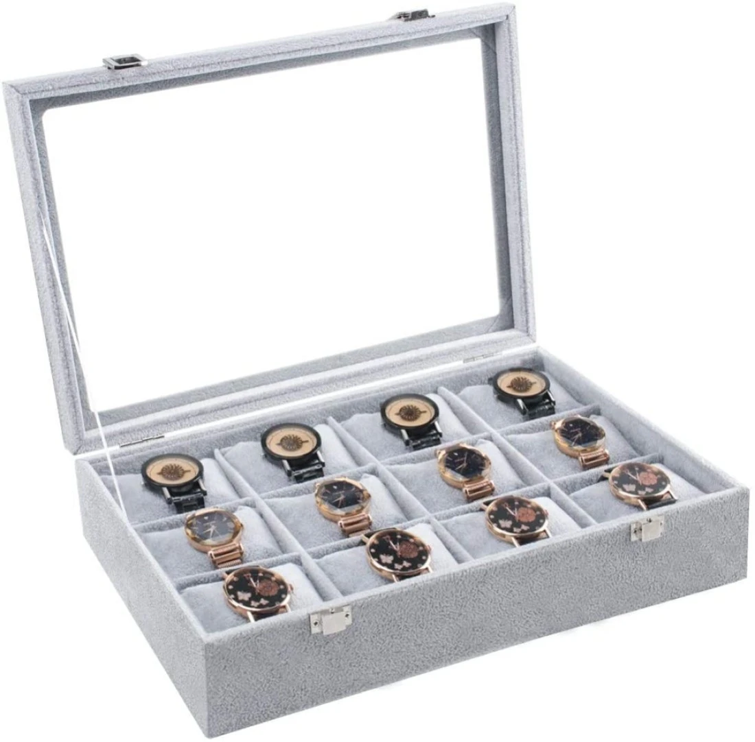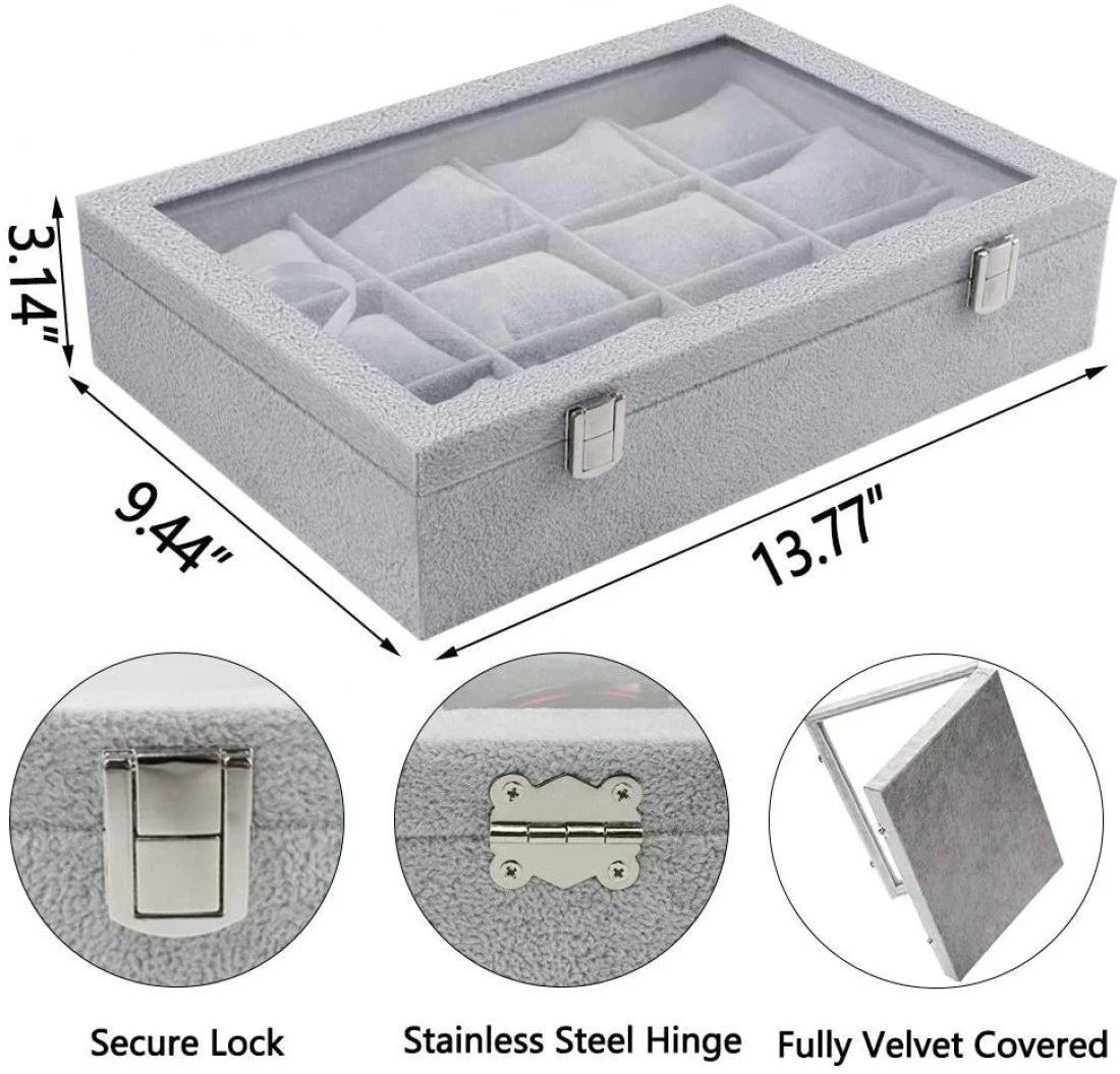 Made of quality Velvet with a clear glass top lid, easy to find watches without opening the box.