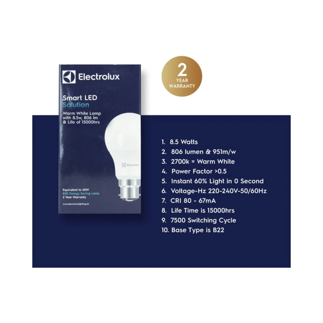 إليكترولوكس B22 ليد لمبة 8.5 واط _أبيض دافئ_
