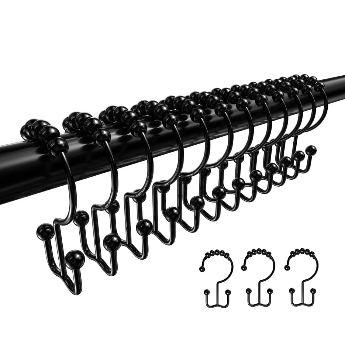 VMVN Shower Curtain Hooks Rings, Rust Resistant Shower Curtain Rings Metal Hook Double Glide Rollers, Shower Hooks for Bathroom Shower Curtain Rods,Set of 12