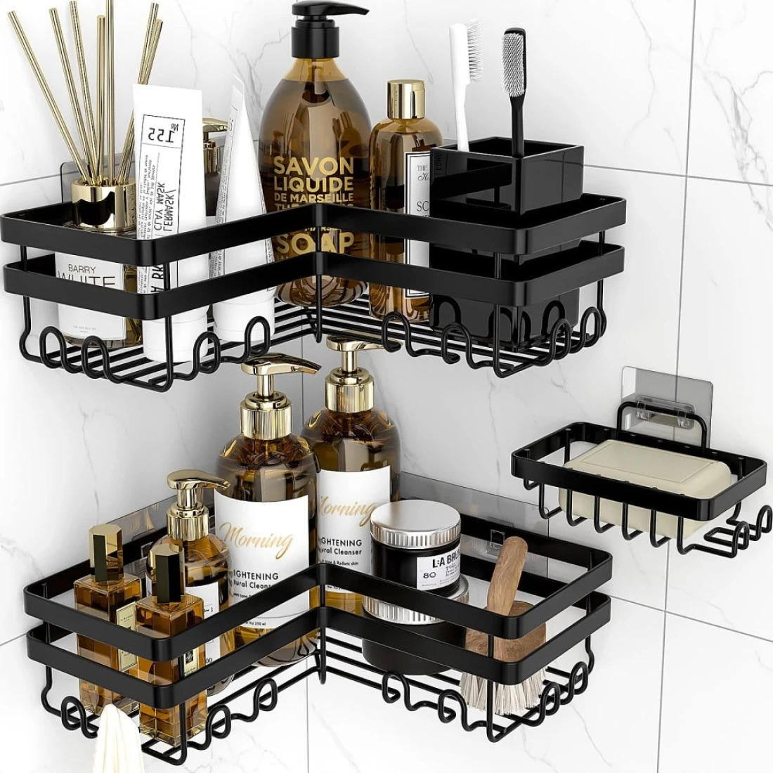 StorageRight Corner Shower Caddy, 3 Pack Adhesive Bathroom Accessories with Soap Holder, Storage Stainless Shower Organizer Shelf with Hooks, No Drilling Shower Shelves for Bathroom, Dorm and Kitchen