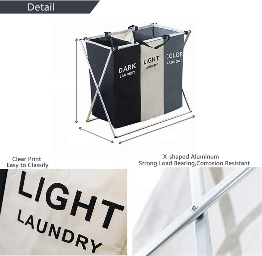 HotsUAE 135L Foldable Laundry Basket Cloth Hamper Sorter Basket 3 Sections With Aluminum Frame 68×60×38Cm