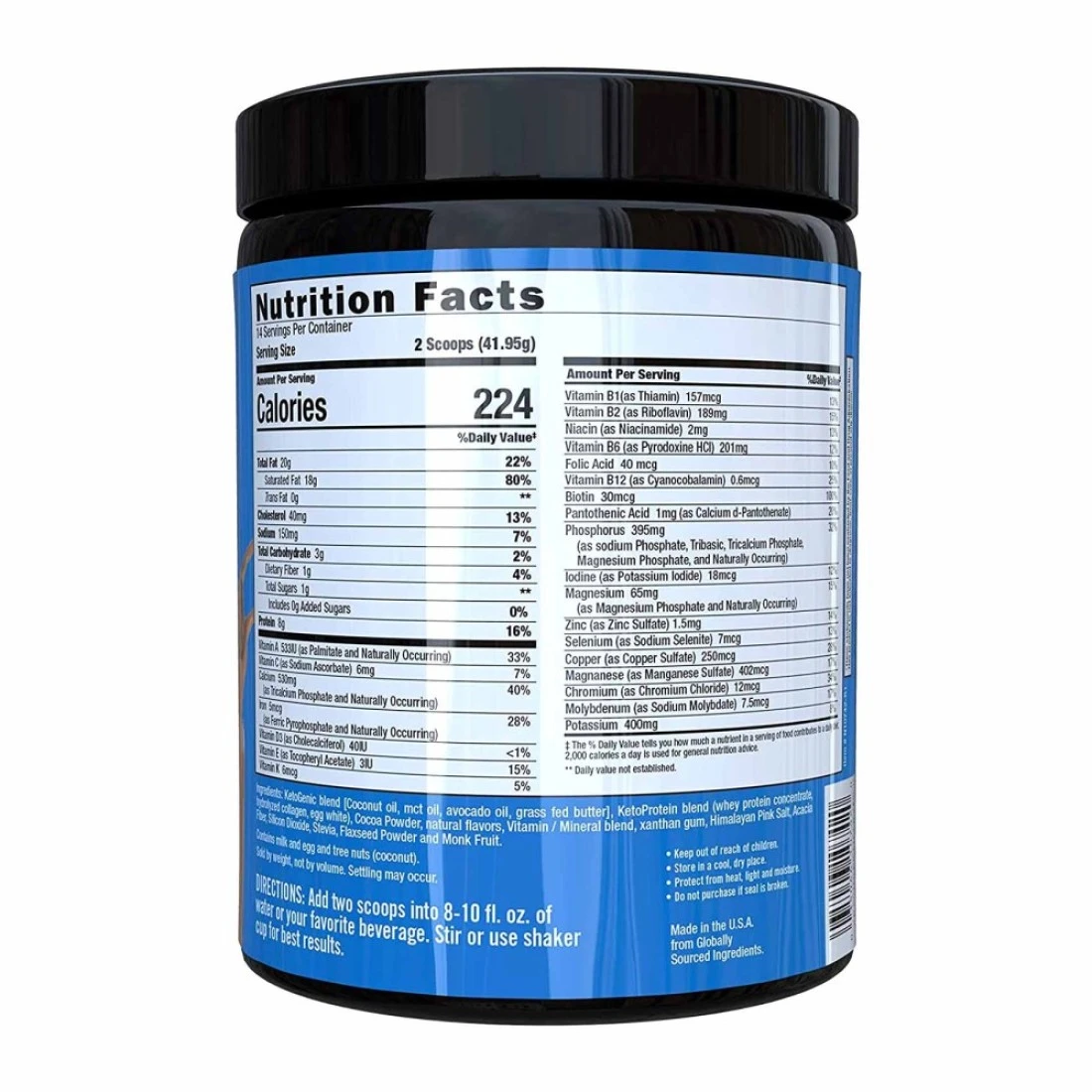 ingredients : مزيج الكيتون [زيت جوز الهند، زيت عباد الشمس، زيت MCT (الدهون الثلاثية متوسطة السلسلة)، زيت الأفوكادو، زبدة العشب]، مزيج بروتين الكيتو (الكولاجين المتحلل، بياض البيض)، الكاكاو، نكهة الشوكولاته الطبيعية، ملح الهيمالايا الوردي، صمغ الزانثان، السيليكا، غليكوسيدات ستيفيول عالية النقاء، مستخلص لو هان جو، صمغ السنط وبذور الكتان.