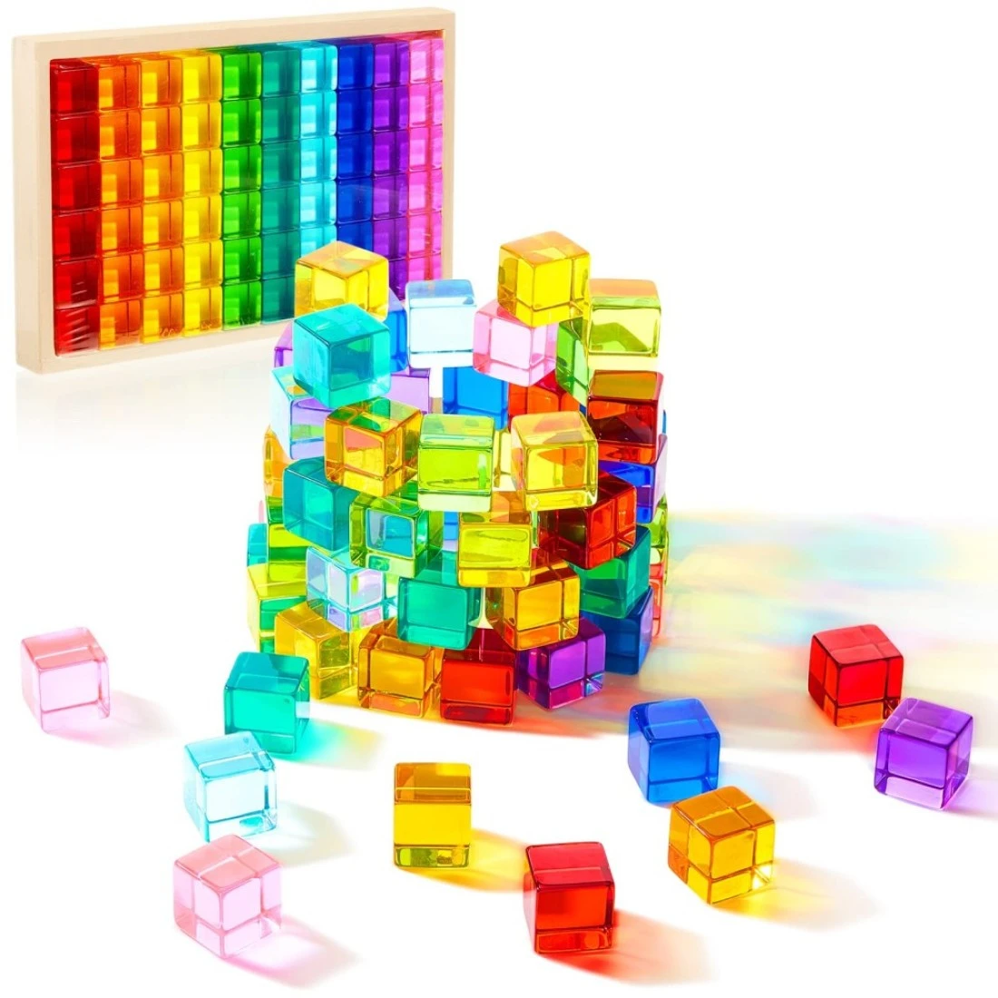 Meooeck 60 Pcs Acrylic Gem Cubes Blocks Translucent Rainbow Building Cubes Crystal Educational Sensory Training Stacking Toys with Wooden Storage Boxes School Supplies Birthday Gift