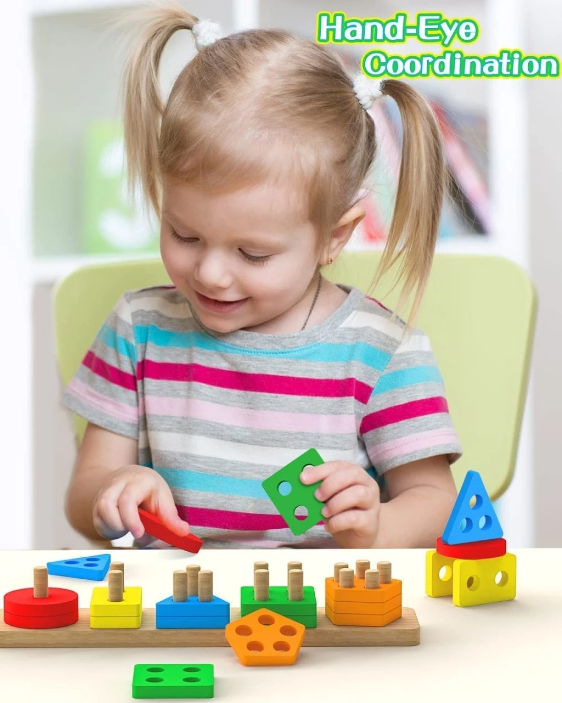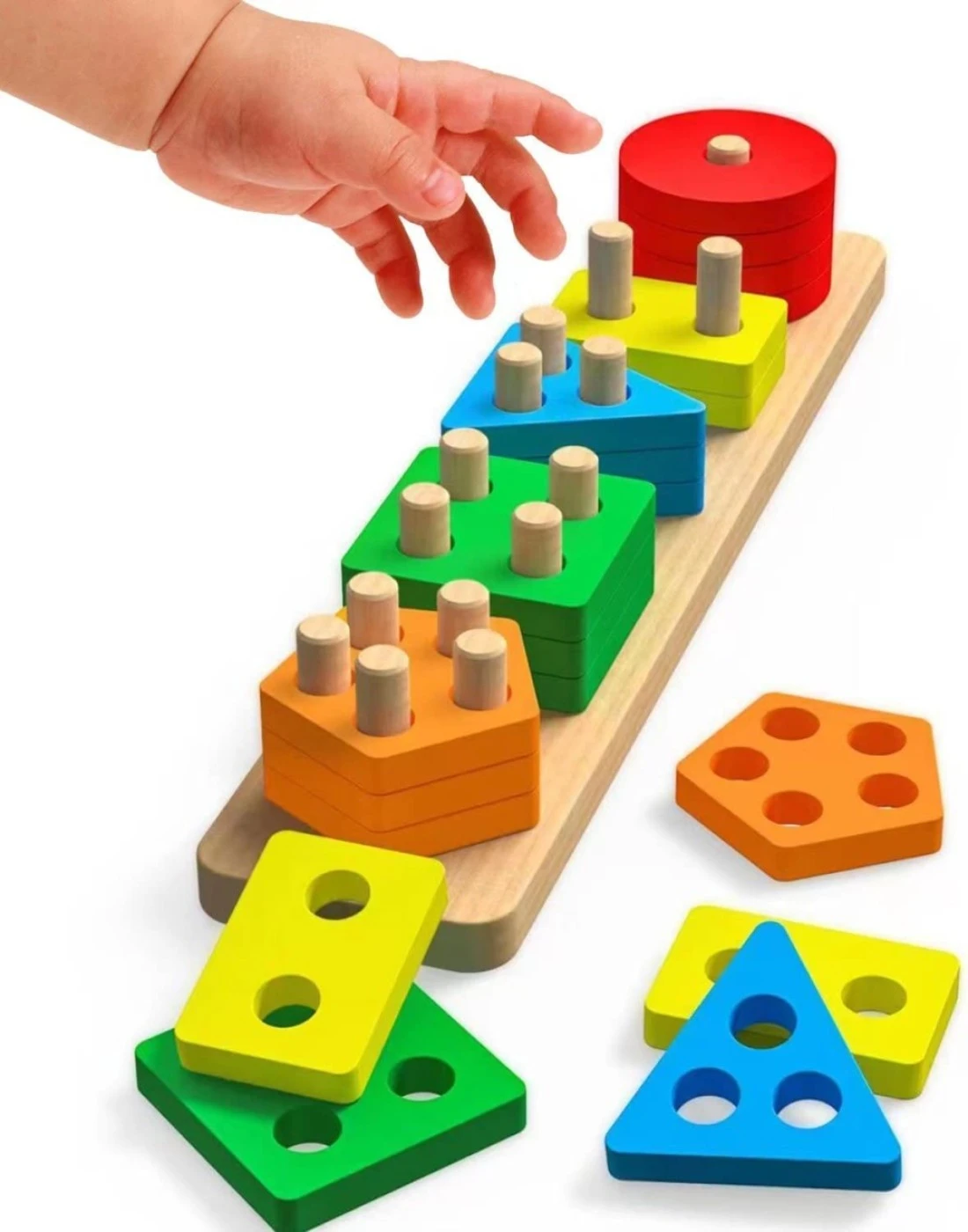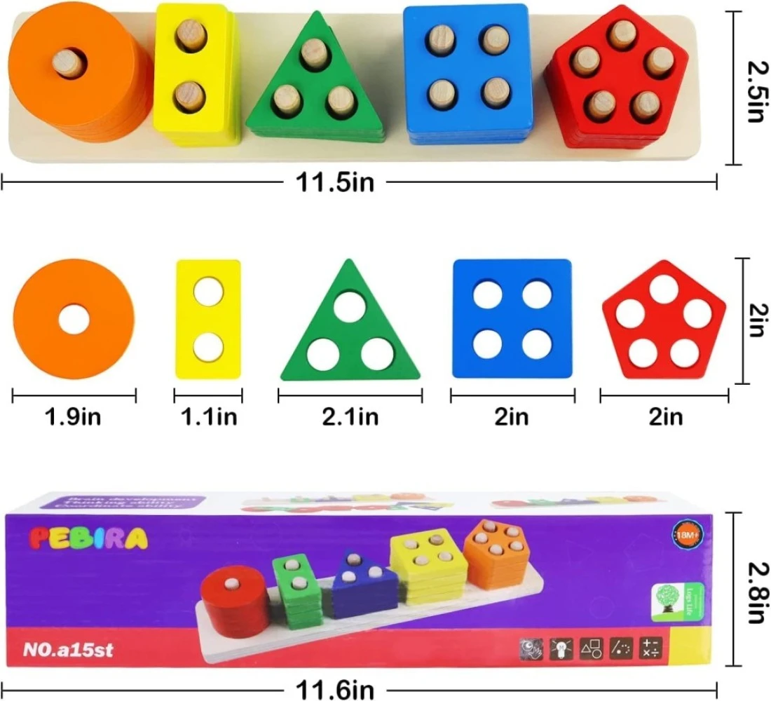 [Toddler Learning Toy]:This Montessori toys for 1 2 3+ year old contains 20 blocks, 5 bright colors and 5 shapes.This helps guide toddlers to learn colors,shapes and numbers as they try to match the blocks to the target and is the perfect project for learning through play