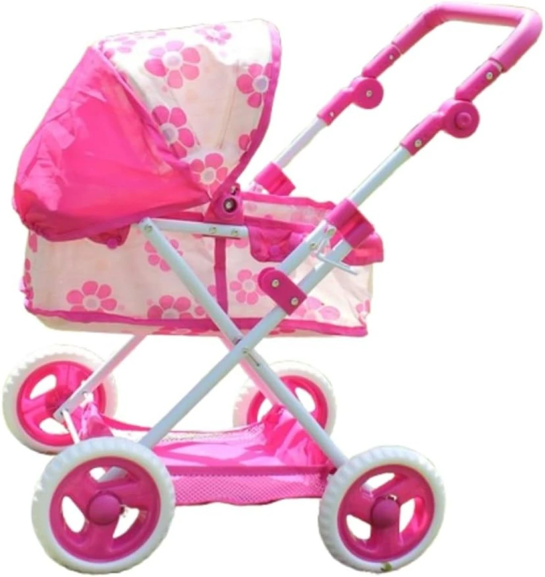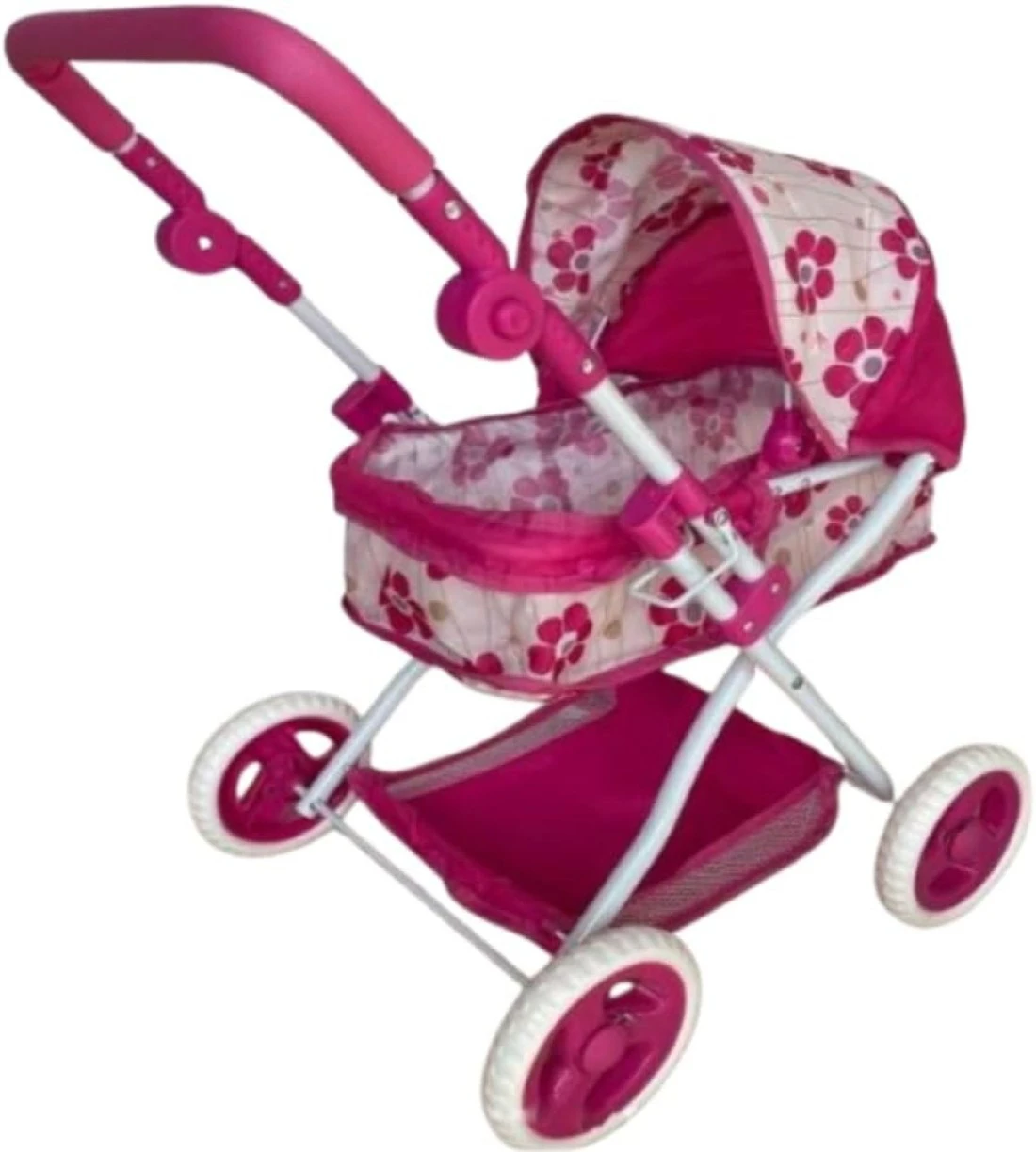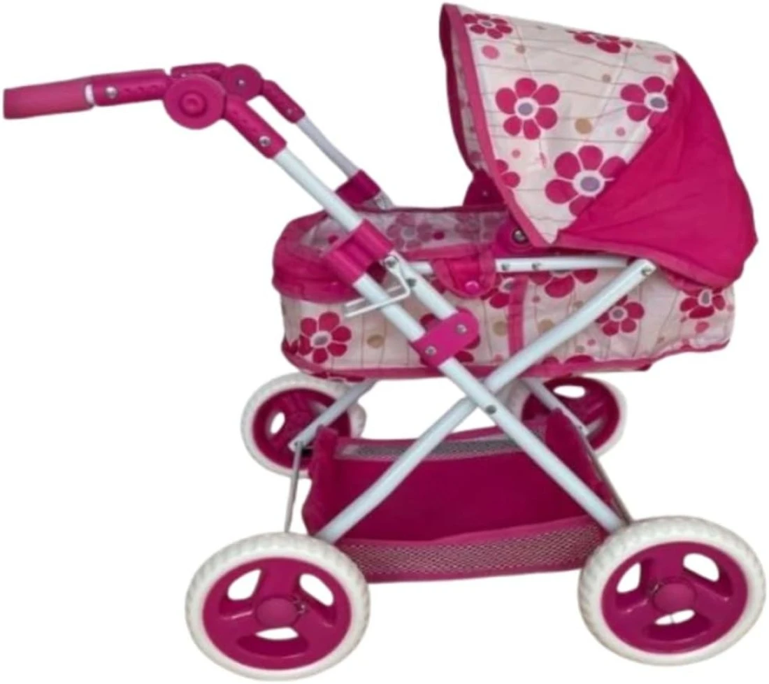 UKR Doll Stroller Canopy Pink for Girls Foldable Girl Pretend Play Toy Dolls Pram with Adjustable Handle Floral Canopy with Storage Basket.