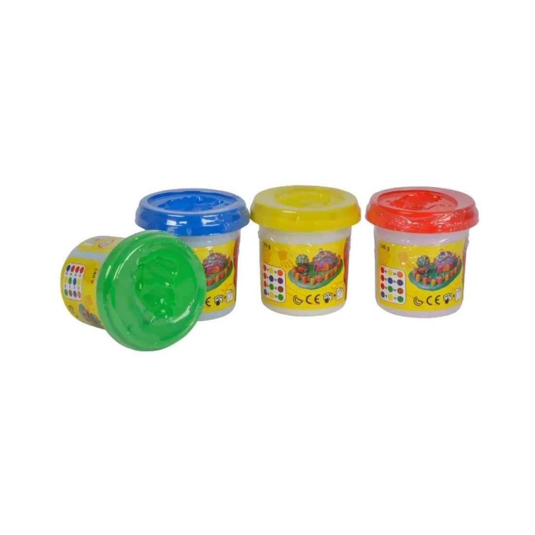 - علب العجينة الناعمة بأربعة ألوان مختلفة كوب 140 غرام باللون الأحمر، الأزرق، الأصفر والأخضر مصنوعة من مواد عالية الجودة
