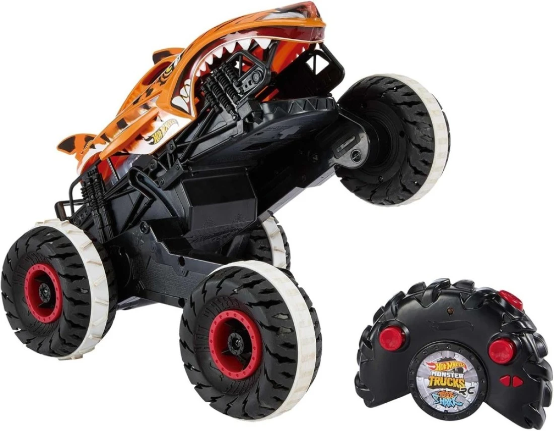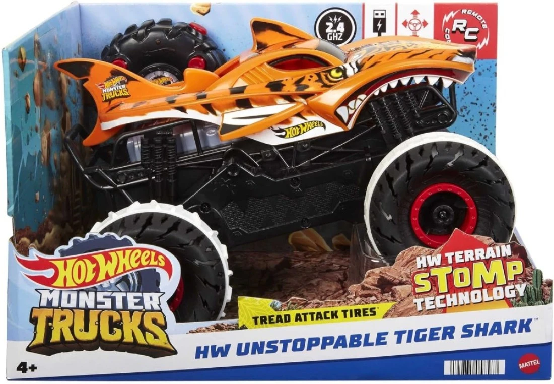The Hot Wheels Monster Trucks HW Unstoppable Tiger Shark R/C attacks terrains like a vicious predator thanks to its HW Terrain Stomp Technology that conquers floors, rocks, grass and more!