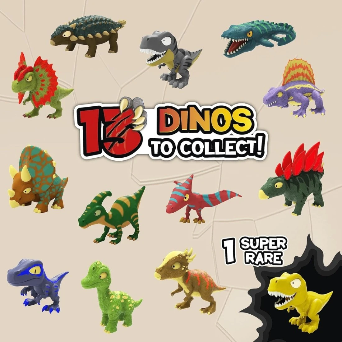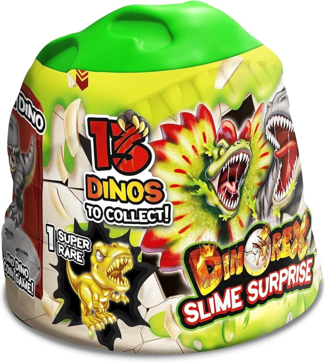 Slime with surprise - Each Dinorex capsule contains 1 dinosaur that you will discover under the slime that falls like lava! There are 13 different dinosaurs to collect, one of which is a rarity, the golden version of the T-Rex. Complete your collection!