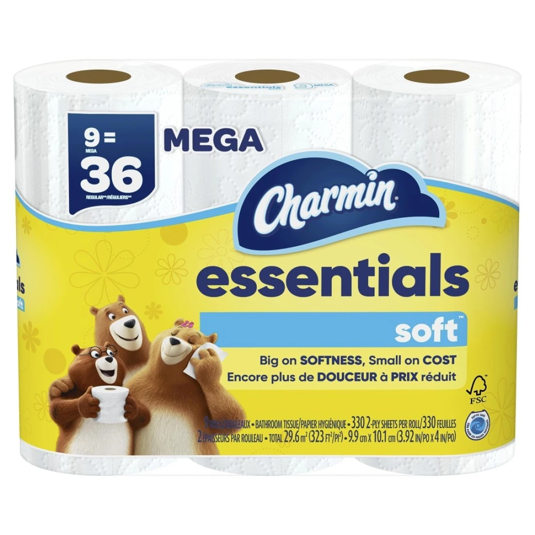 Charmin Essentials Soft Toilet Paper, 9 Mega Rolls = 36 Regular Rolls