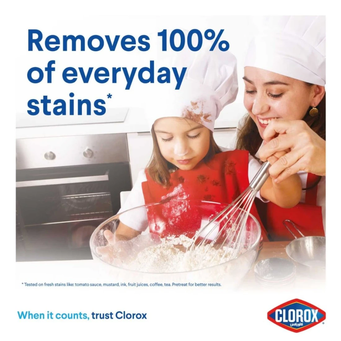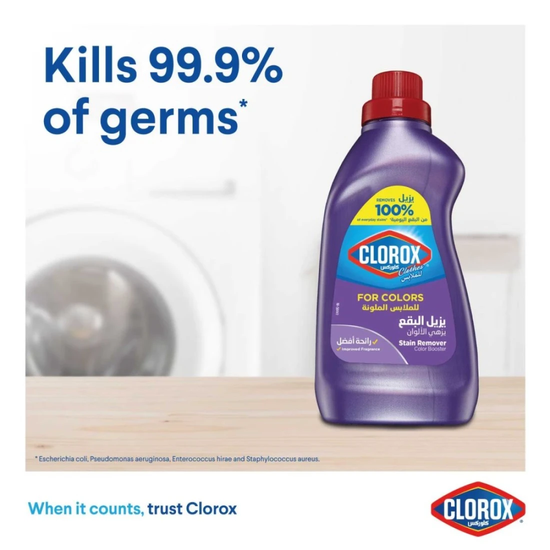 - إزالة البقع: استخدمي كلوركس للملابس الملونة مع مسحوق الغسيل لإزالة لإزالة بقع الدهون بالإضافة للقهوة، الشاي، الكاتشب و العصير. يزيل 100% من البقع اليومية . آمن للإستخدام على الأقمشة الحساسة بما في ذلك الحرير و الصوف