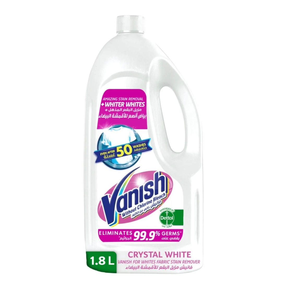 - امسحي بعيدا عنكِ الضغوط والبقع واستمتعي بغسيل خالٍ من البقع في كل مرة! مزيل البقع فانيش كريستال وايت للأقمشة البيضاء يزيل حتى أصعب البقع المجففة بلطف من الأقمشة البيضاء اليومية الخاصة بكِ.