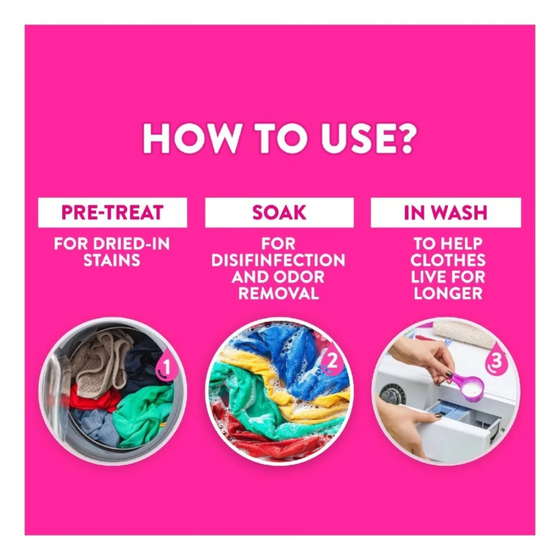 - استمتع بغسيل خالٍ من الفيروسات والبكتيريا مع مزيل البقع فانيش الذي يحتوي على عامل مطهر قوي مثل بيركربونات الصوديوم الذي يقضي بأمان على 99.9% من الفيروسات والبكتيريا