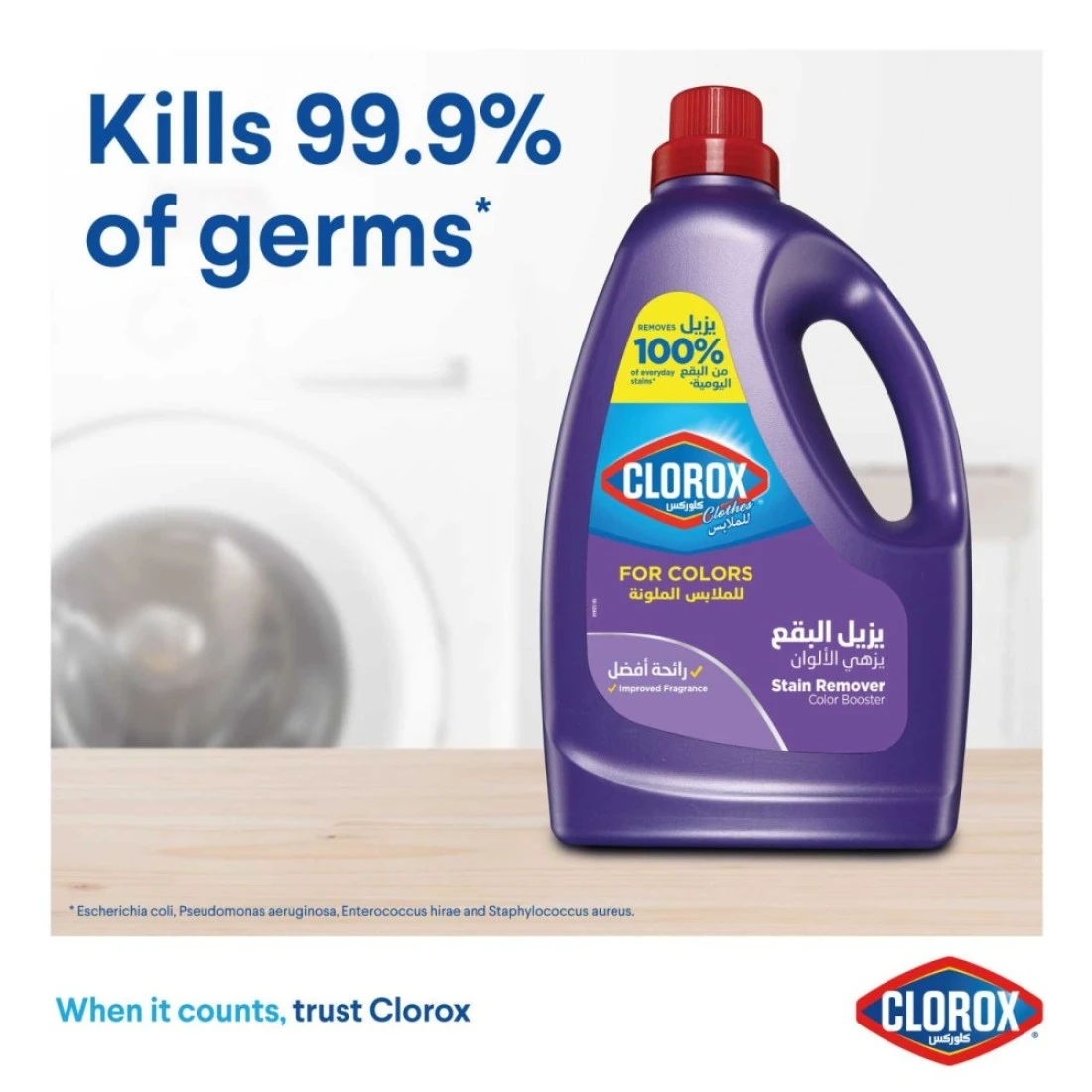 - إزالة البقع: استخدمي كلوركس للملابس الملونة مع مسحوق الغسيل لإزالة لإزالة بقع الدهون بالإضافة للقهوة، الشاي، الكاتشب و العصير. يزيل 100% من البقع اليومية . آمن للإستخدام على الأقمشة الحساسة بما في ذلك الحرير و الصوف
