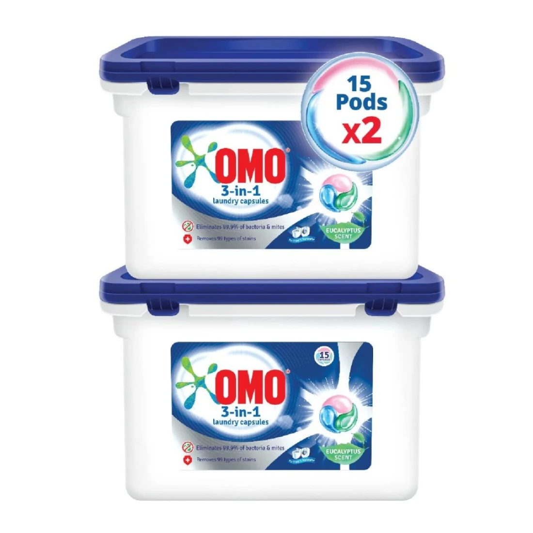 أومو 3 في 1 كبسولات سائل غسيل منظف إزالة البقع برائحة الأوكاليبتوس، 15 كبسولة حزمة من 2