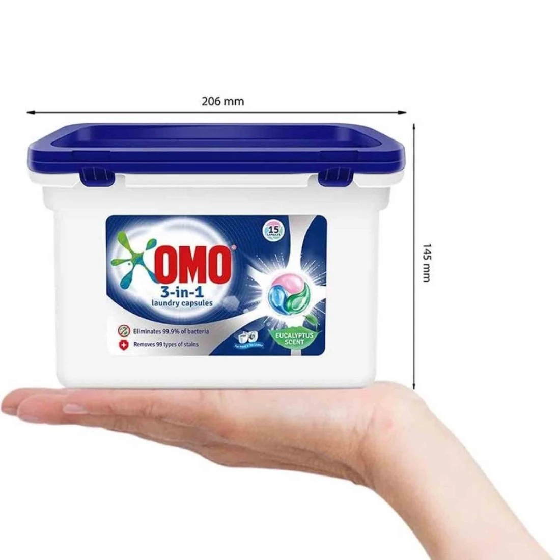 كبسولات الغسيل أومو هي الطريقة الذكية للغسيل. كبسولات الغسيل أومو 3 في 1 برائحة الأوكالبتوس المنعشة مُصممة خصيصًا لإزالة البقع الصعبة والقضاء على البكتيريا والعناية بنسيجك. ما عليك سوى وضع الكبسولة في الجزء الخلفي من حلة الغسالة وإضافة الغسيل والإستمتاع بالنتائج الرائعة. تتميز كبسولات منظف الغسيل أومو 3 في 1 سهلة الإستخدام بأنها مريحة وقوية. تذوب بسرعة لإزالة البقع بسرعة وفعالية. كبسولات الغسيل أومو مناسبة لجميع أنواع الأقمشة والغسالات. توفر كبسولات الغسيل المضادة للبكتيريا لإزالة البقع من أومو تنظيفًا لطيفًا وفعالاً من خلال إختراق الأقمشة بعمق لإزالة البقع الزيتية الصعبة والقضاء على 99.9% من البكتيريا. كما أنها خالية من المبيضات. تم تصميم كبسولات الغسيل من أومو لمحاربة 99 نوعًا من البقع مما يترك ملابسك نظيفة وناعمة وبرائحة منعشة رائعة. تعتبر كبسولات أومو فعالة أثناء الغسيل الرئيسي سواء في الغسالة ذات التحميل العلوي أو في الغسالة ذات التحميل الأمامي. هذه الكبسولات المريحة النظيفة والمكتفية بذاتها مناسبة لجميع أنواع الآلات. تبدأ كبسولات أومو في العمل على الفور لإزالة البقع والبكتيريا. إستخدمي كبسولة واحدة للحمولة الصغيرة، و2 للحمولة المتوسطة، أو ما يصل إلى 3 كبسولات للحمولة الكبيرة أو شديدة الإتساخ.