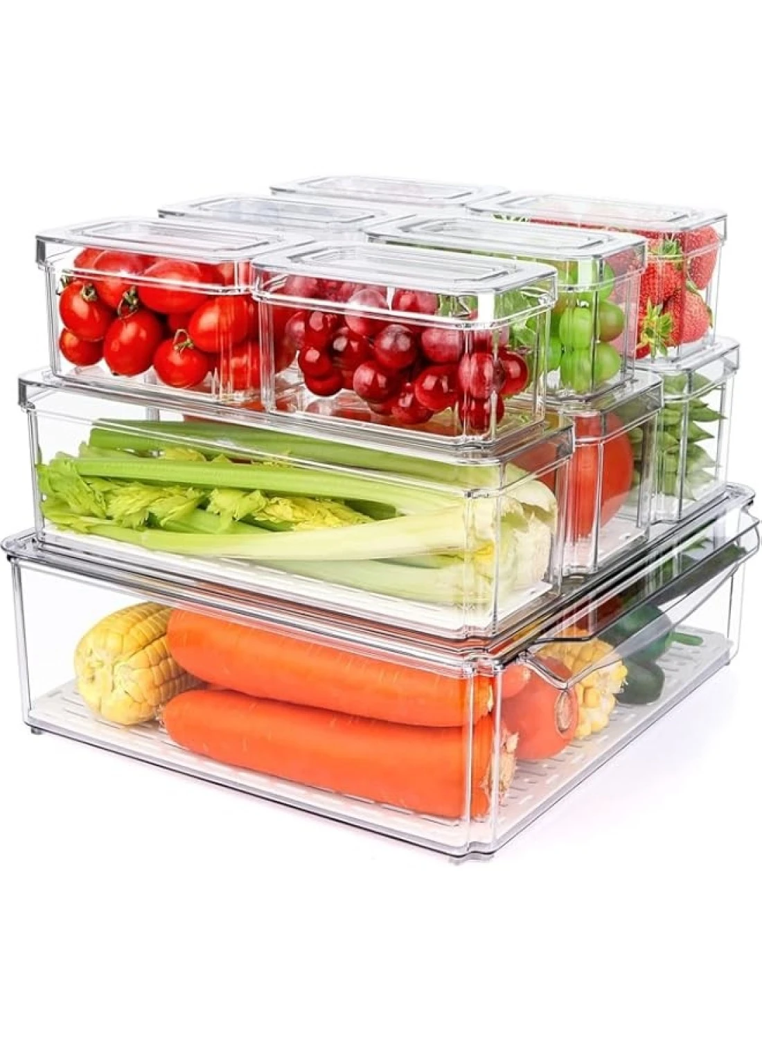 10 Pack Clear Stackable Fridge Organiser Bins with Lids & Drain Tray, Large Size Plastic Food Storage Containers for Fruit & Vegetable Storage, Kitchen Storage & Organisation (3 different sizes)
