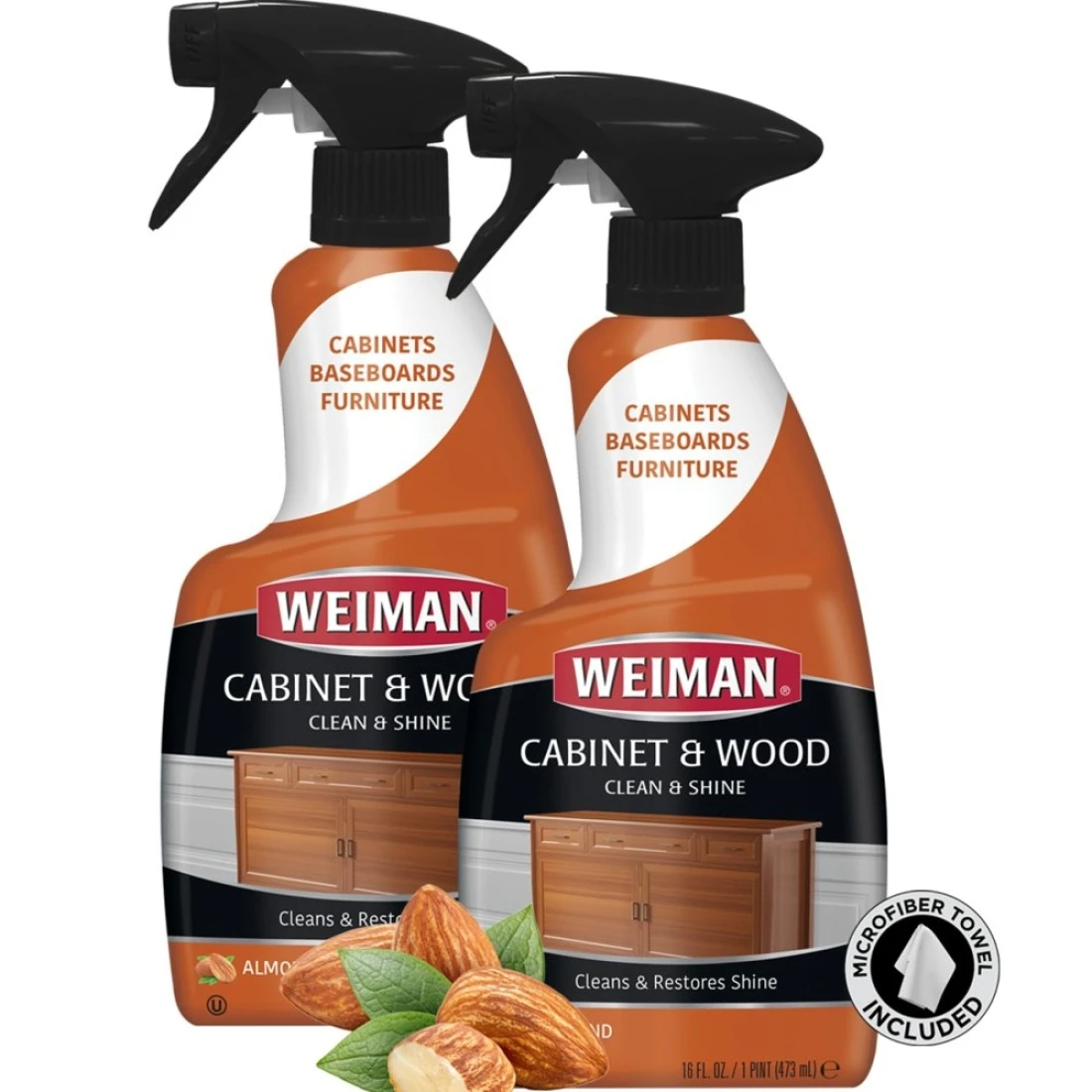 Weiman Cabinet and Wood Cleaner, Shine, Clean and Protect Spray - For Wood Cabinets, Furniture, Tables, Baseboards, Trim and more, 16 oz, 2 PACK with MicroFiber Towel