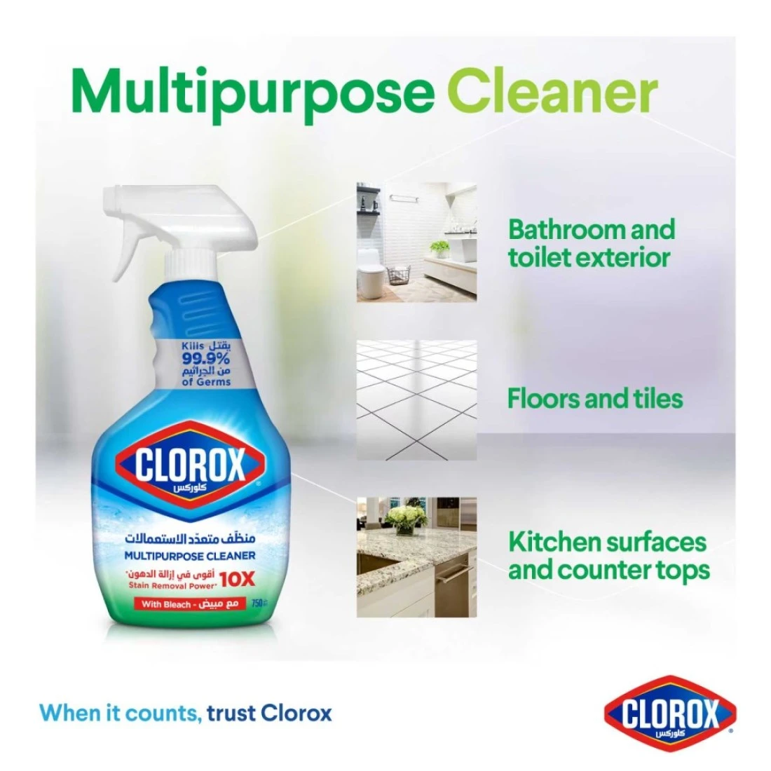 - بخاخ مطهر: نظفي وطهري باستخدام منظف البخاخ القوي متعدد الاستعمالات من كلوركس والذي يقتل 99.9% من الجراثيم الموجودة في منزلك. منظف متعدد الاستعمالات: اجعلي منزلك متألقًا مع منظف كلوركس متعدد الاستعمالات الذي يمكن استخدامه لتنظيف وإزالة البقع عبر الحمامات والمراحيض والأرضيات والبلاط والمطابخ والعدادات والأسطح الأخرى حول منزلك.10X أقوى في إزالة البقع: منظف كلوركس متعدد الاستعمالات لديه القدرة على إزالة البقع من مختلف الأسطح في جميع أنحاء منزلك.سهل و مريح في الإستخدام: يسمح البخاخ برش المنتج على الأسطح بشكل متساوي ما يسمح بتوزيع المنتج بسهولة، كما أنه سهل الإستخدام مع مبيض: منظف كلوركس متعدد الاستعمالات هو بديل تنظيف الكل في واحد مع المبيض. قومي بتنظيف وتطهير الأسطح التي يتم لمسها باستمرار بشكل آمن واستخدمها في أي مكان تتراكم فيه الأوساخ أو الجراثيم.