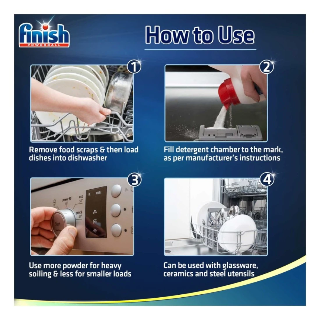 - إستخدم دائمًا مسحوق فينيش كلاسيك مع مساعد الشطف والملح li>