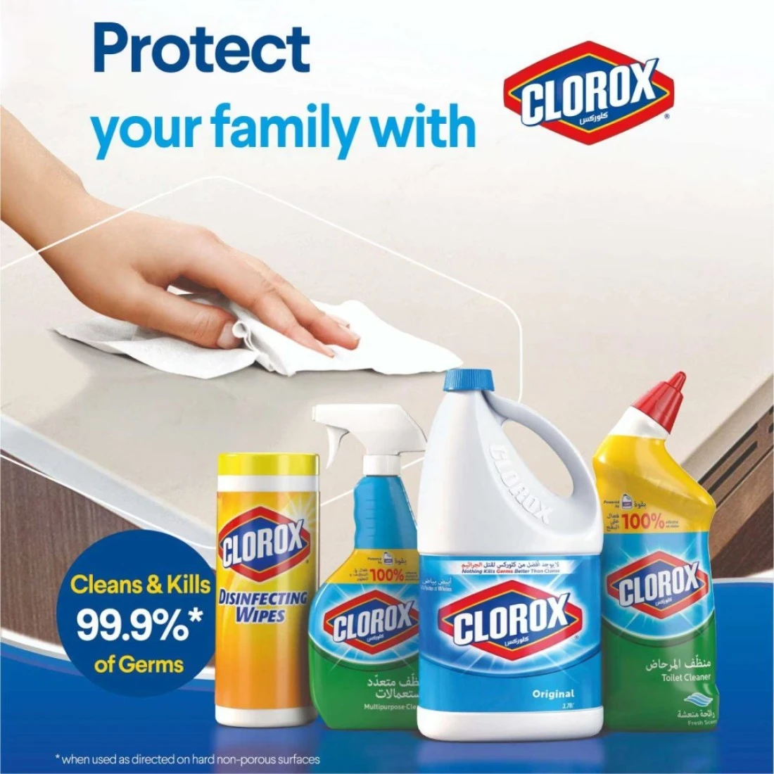 يقتل 99.9% من الجراثيم. تطبيق دقيق ومثالي للإستخدام المباشر. تنظيف سريع وسهل في جميع أنحاء المنزل. رائع لإزالة البقع من الملابس البيضاء.